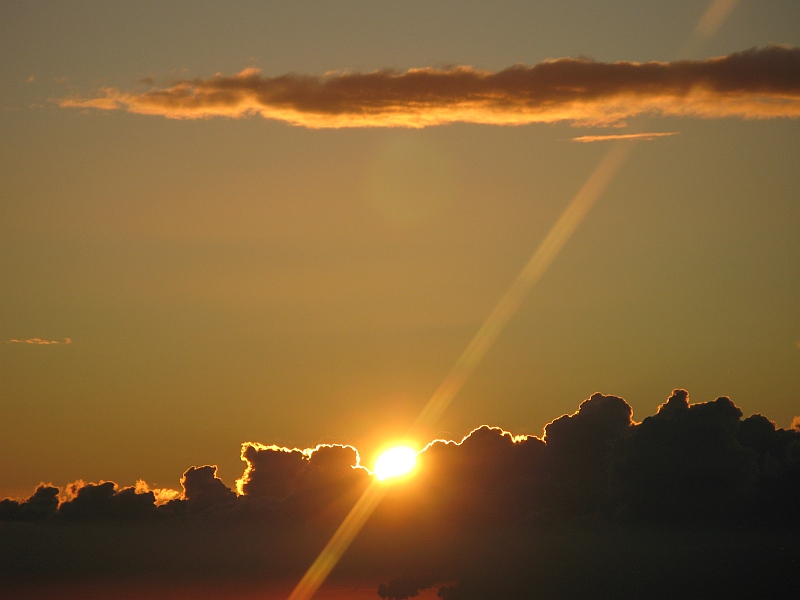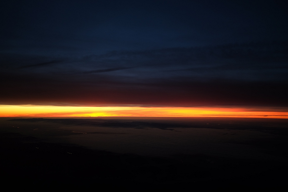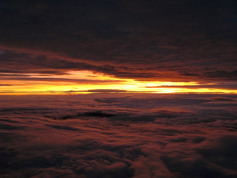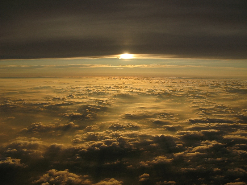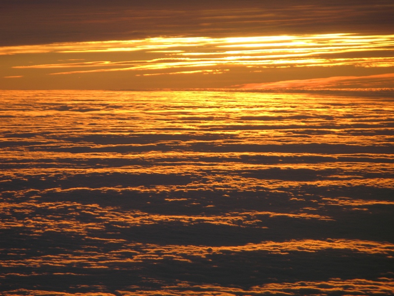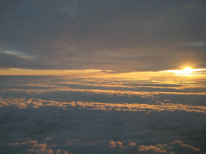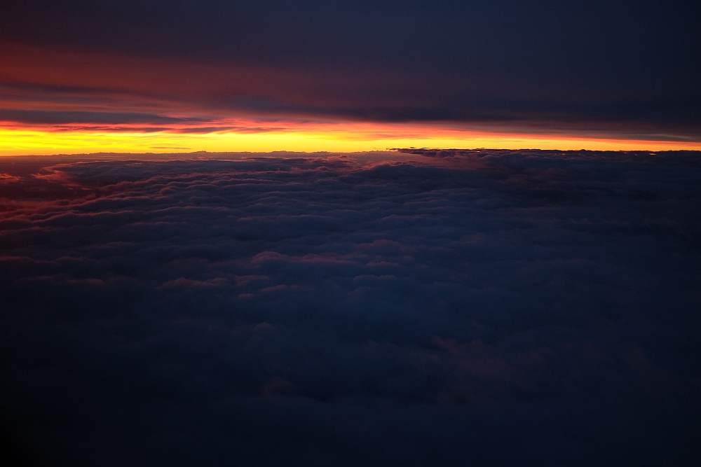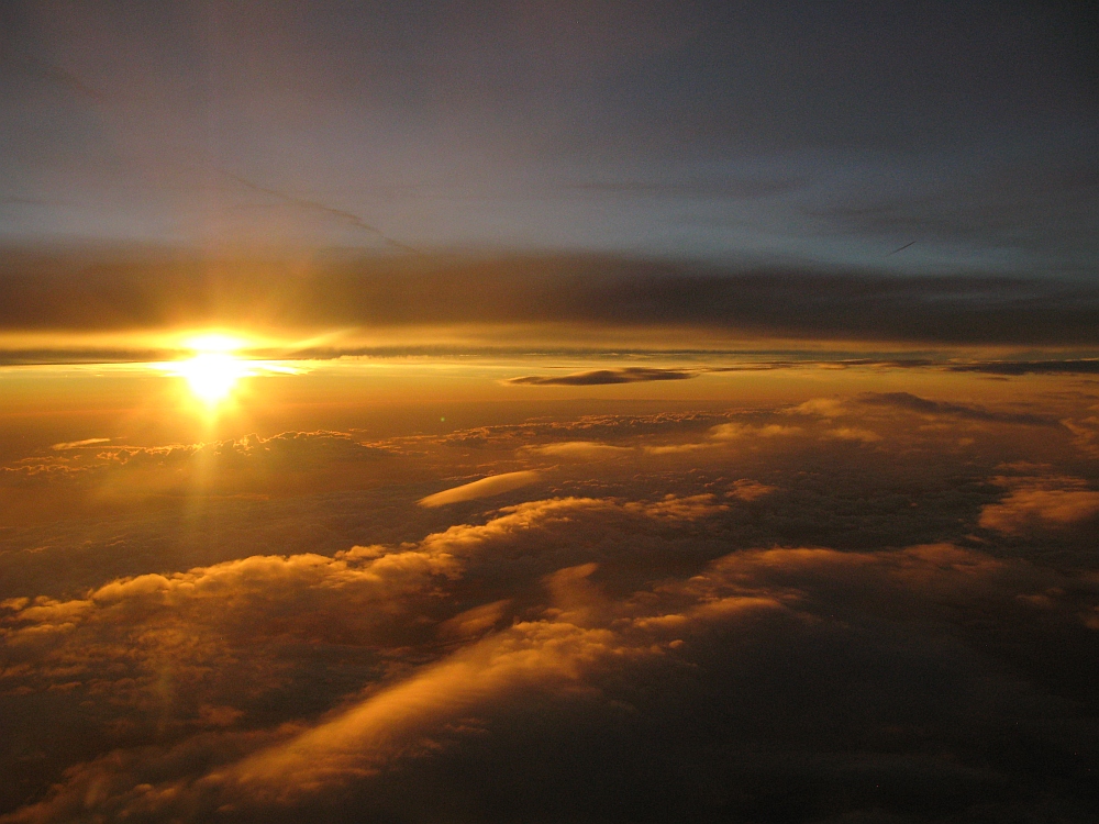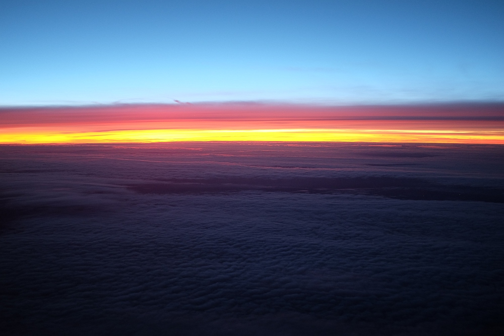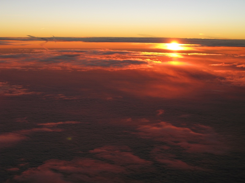 Wieder auf dem Heimflug. Der erste Sonnenuntergang seit 10 Tagen.
