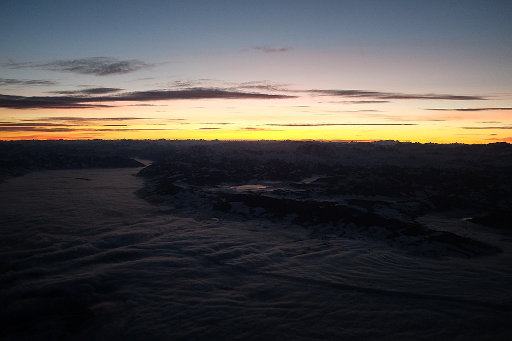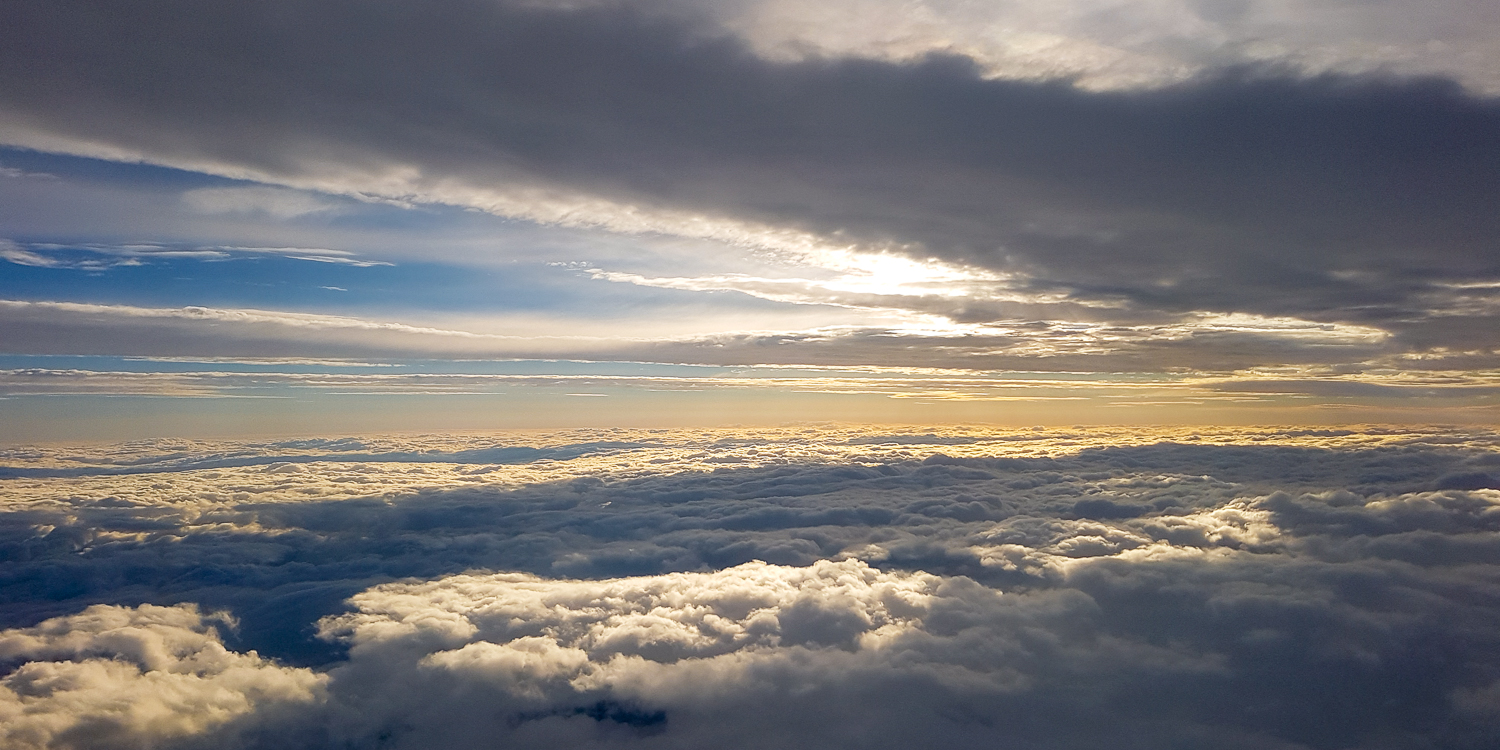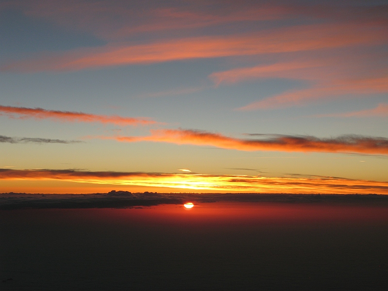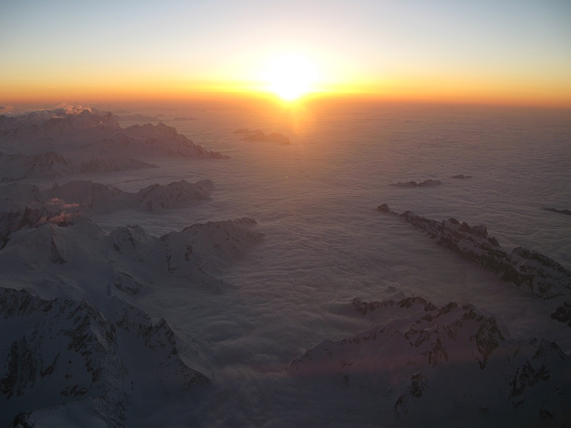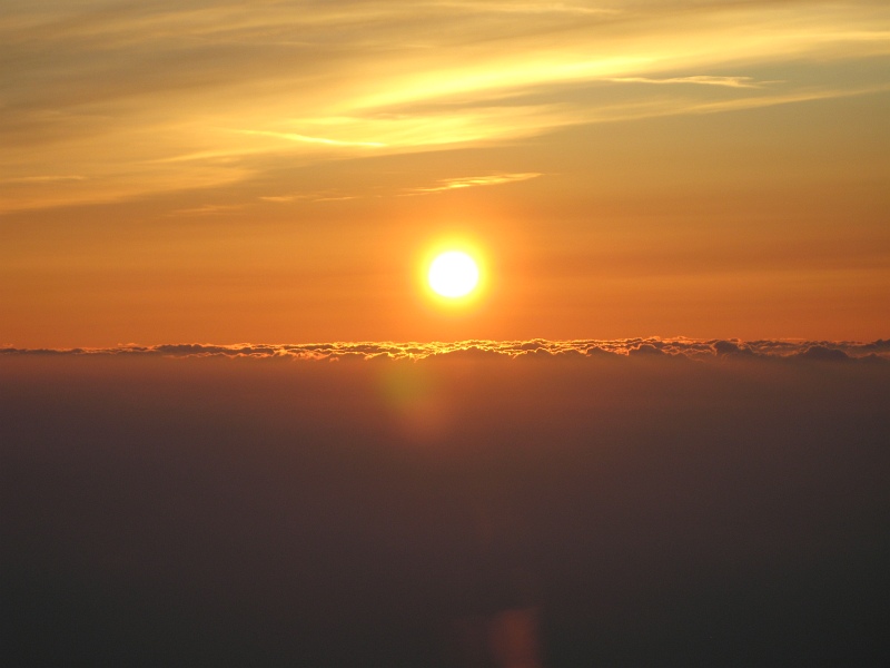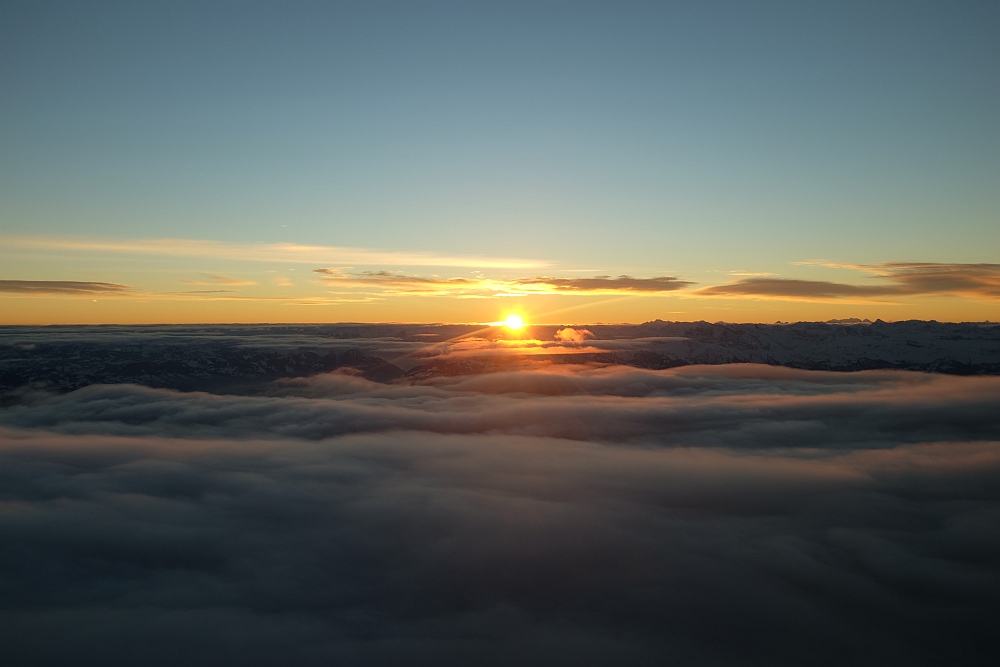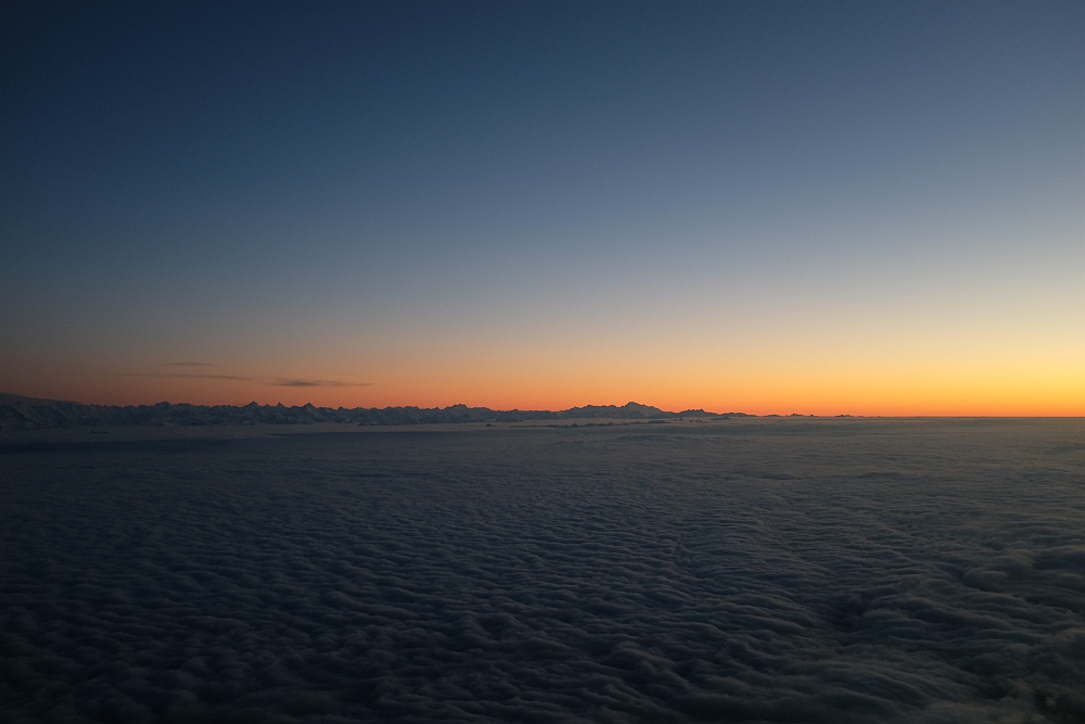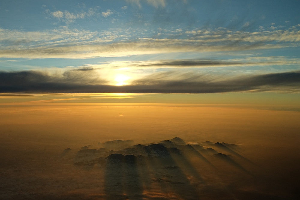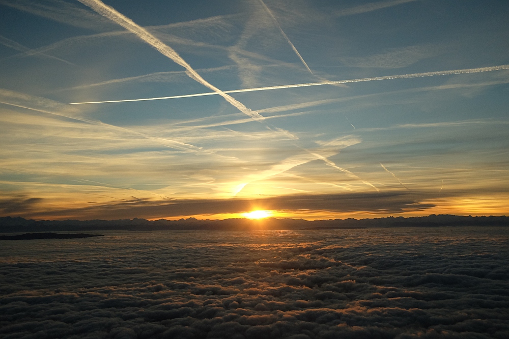 Wieder auf dem Heimflug. Der erste Sonnenuntergang seit 10 Tagen.
