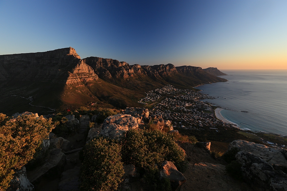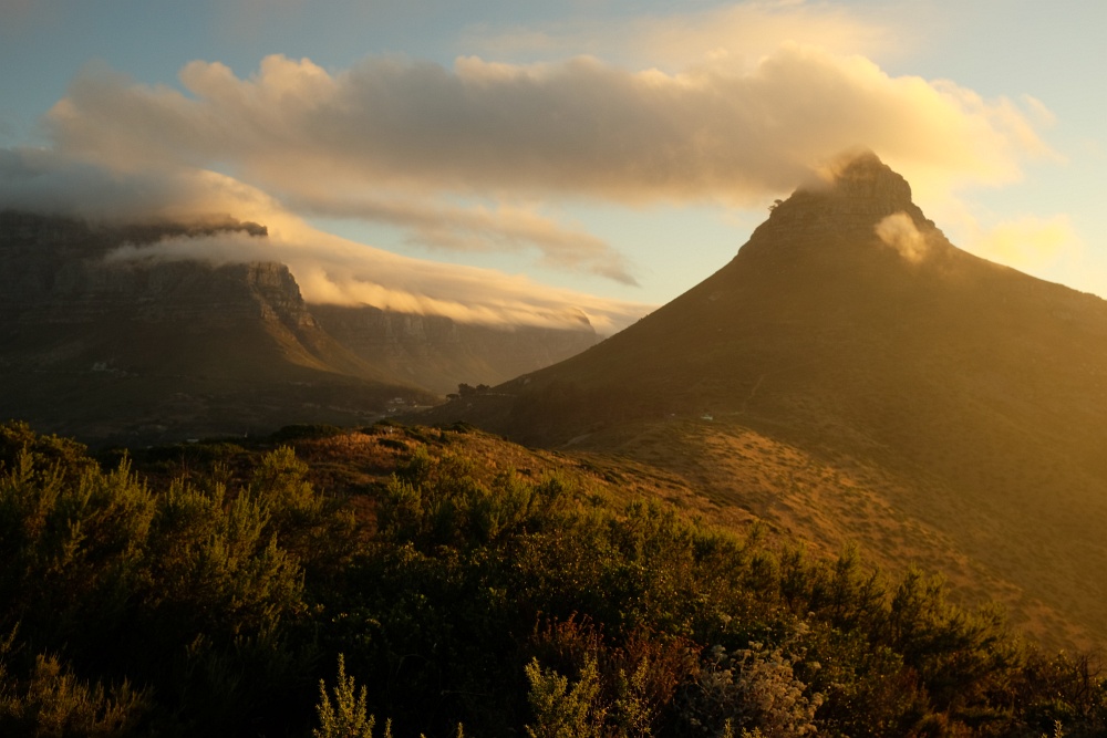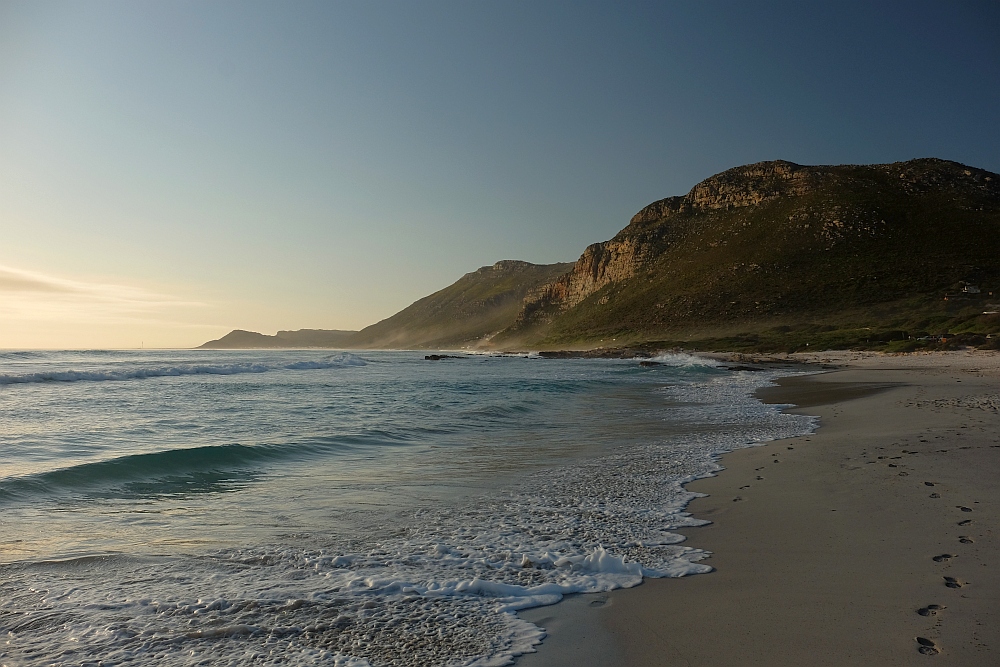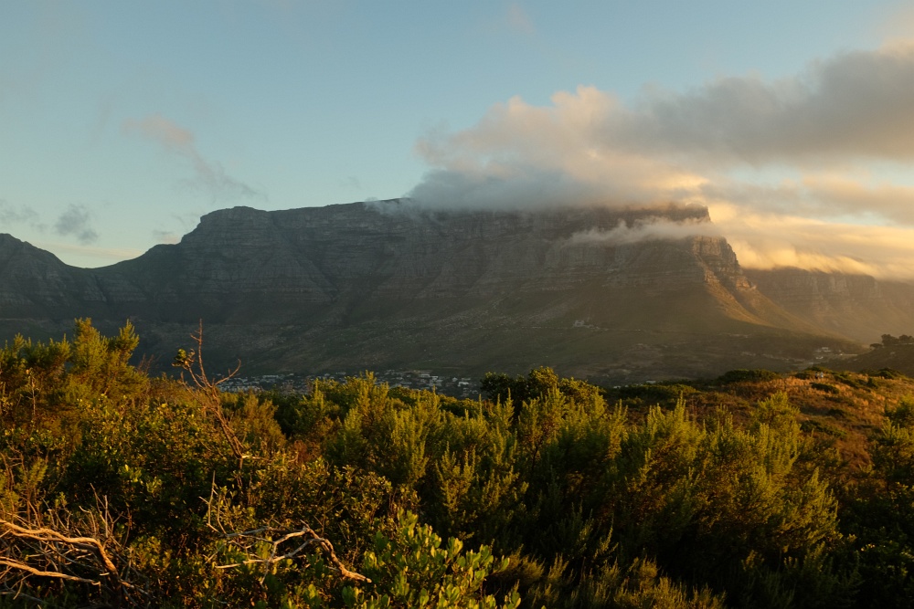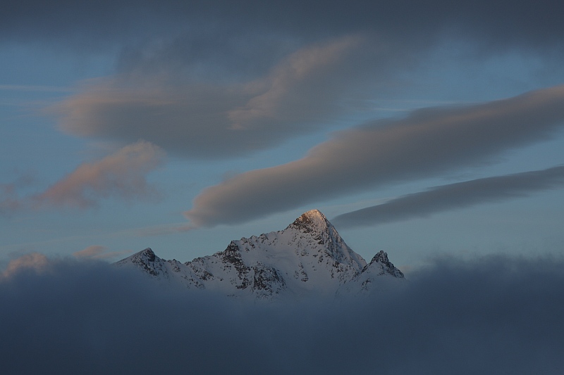 Die Berge am Eingang des Kaldfjords werden von den letzten Sonnenstrahlen des Tages beleuchtet.