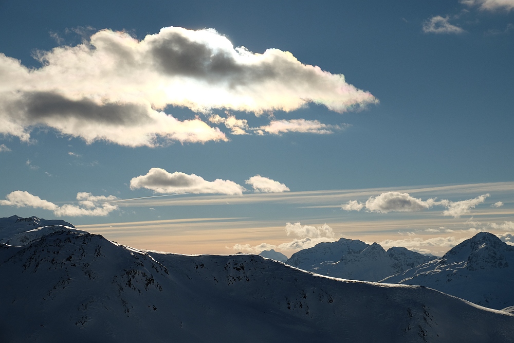 Die tief verschneiten Gipfel der Lofoten am Raftsund.