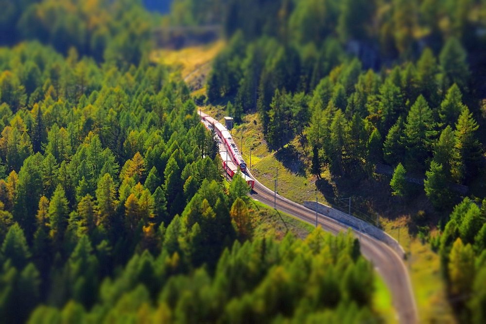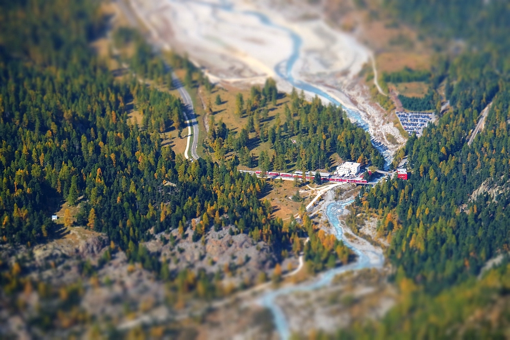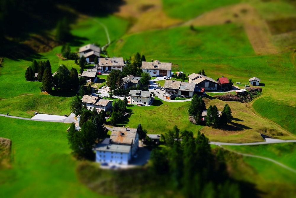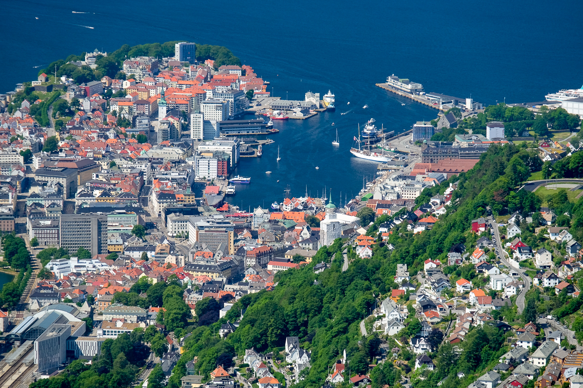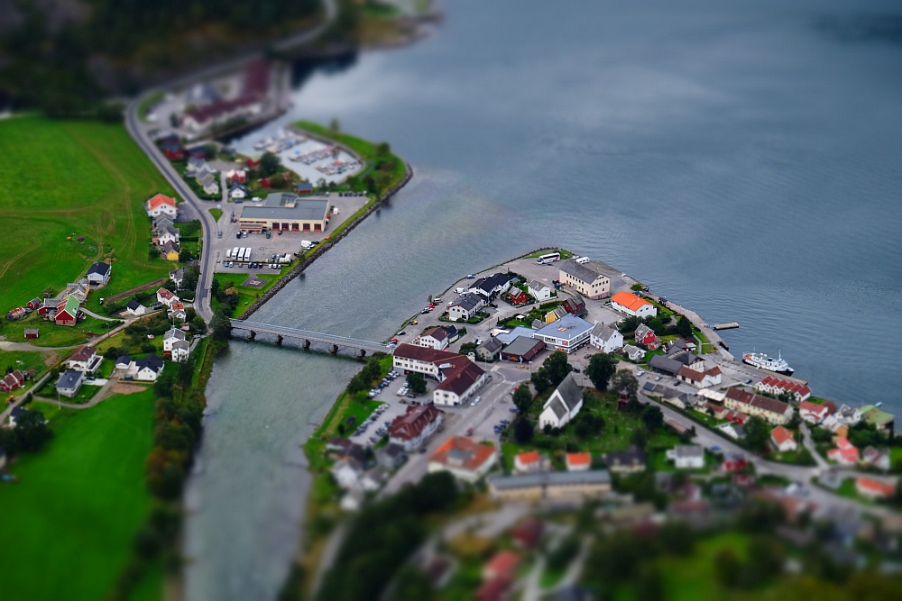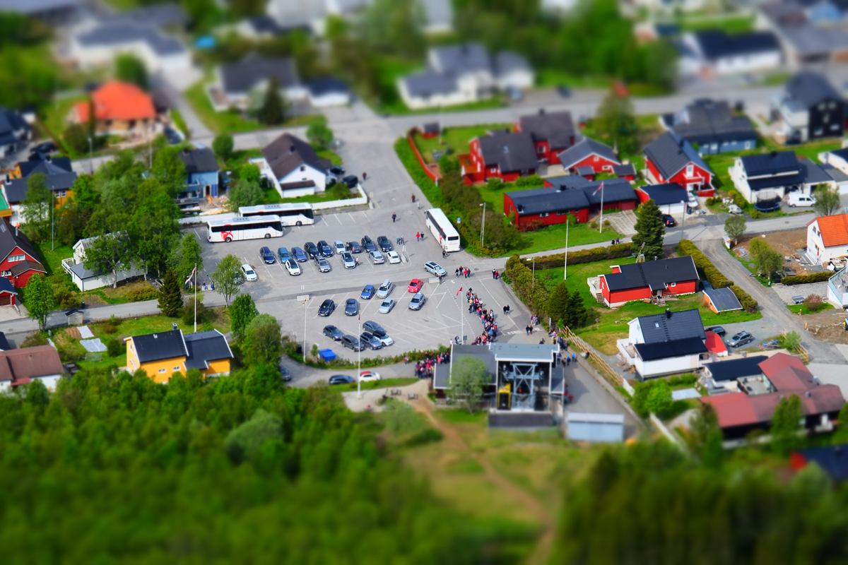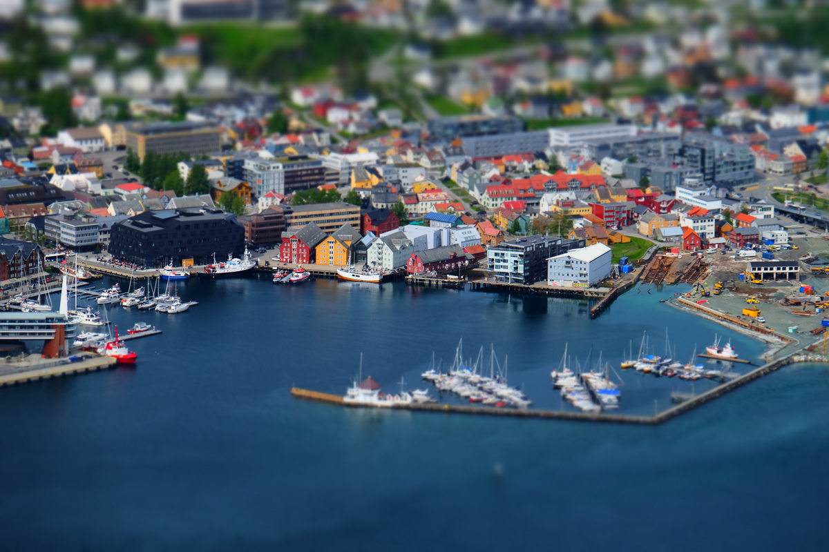 Tilt-Shift-Aufnahme des Hafens von Tromsø. Das Foto wurde vom 400 Meter hohen Storsteinen aus gemacht.