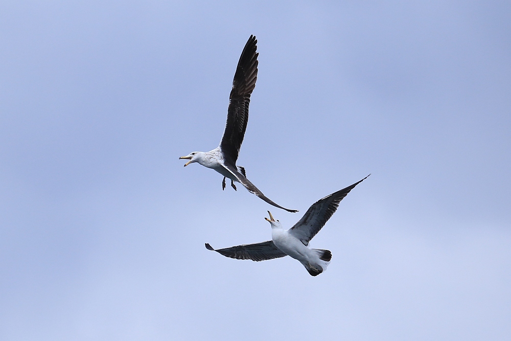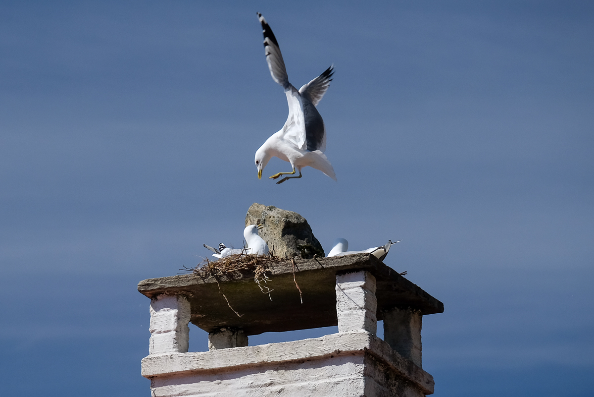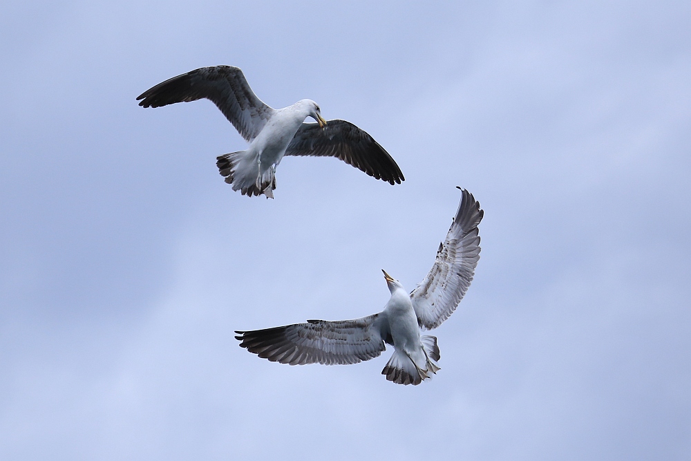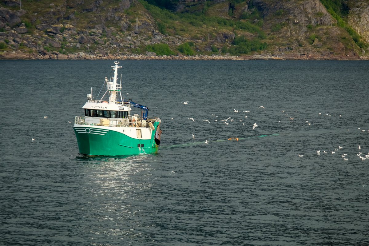 Seemöwen versuchen, etwas vom Fang dieses Fischkutters vor Fugløya abzubekommen.