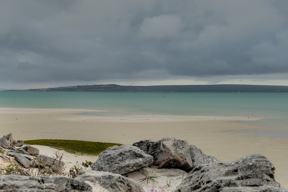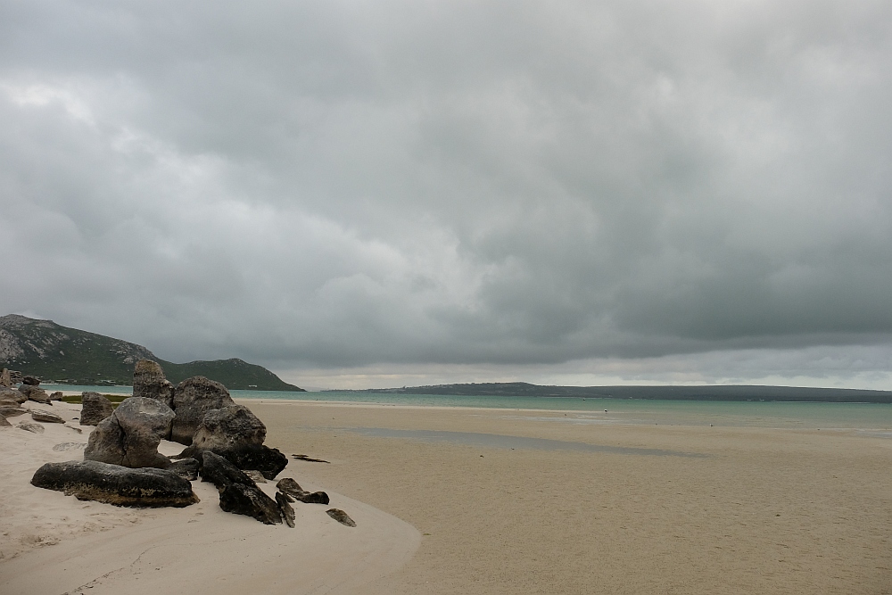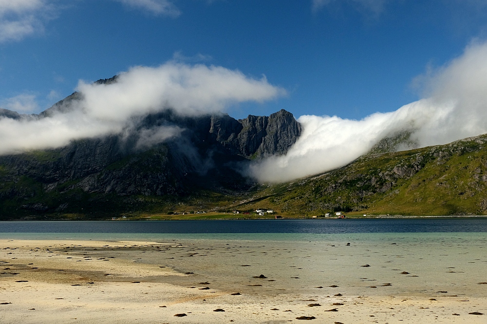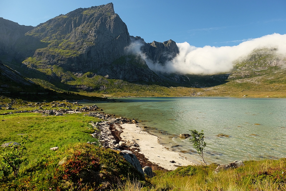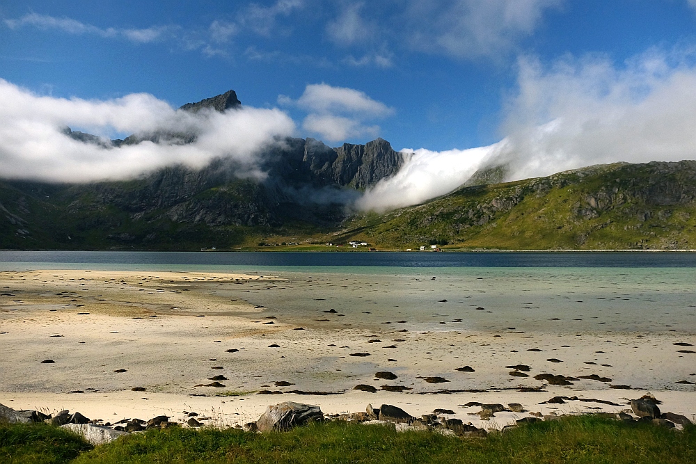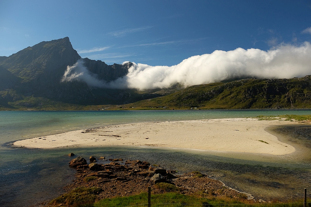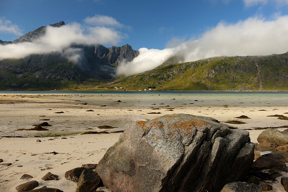 Ein weiterer kleiner Sandstrand in der Bucht Flakstadpollen, im Hintergrund der Stortinden