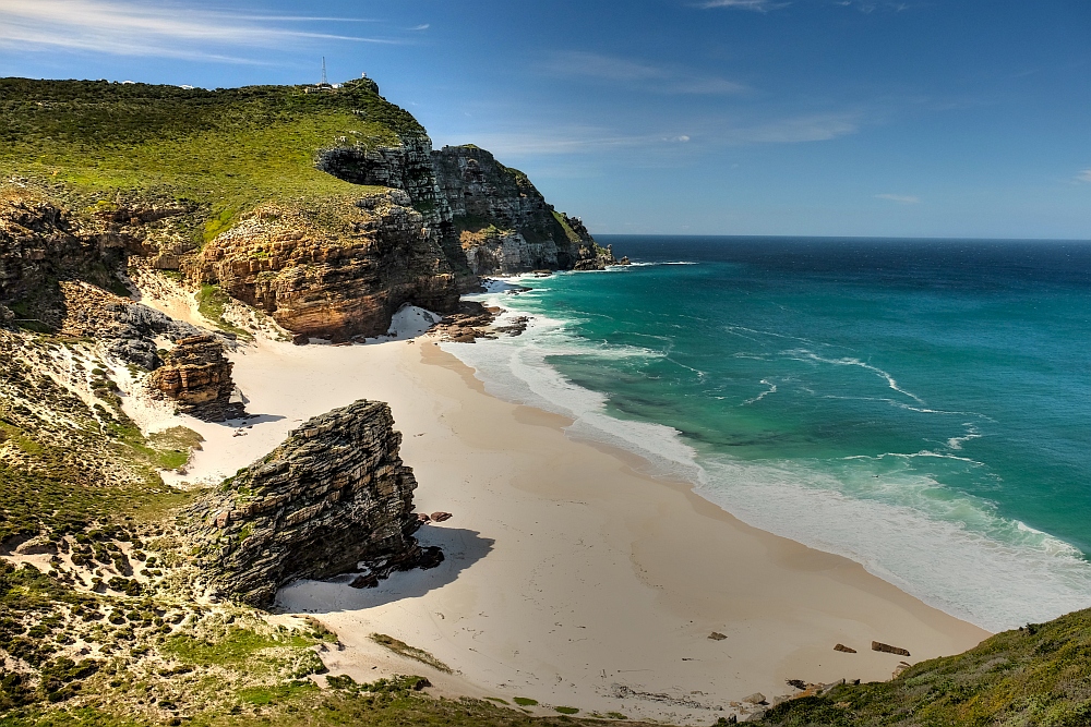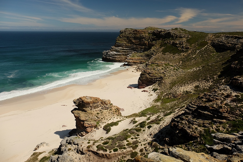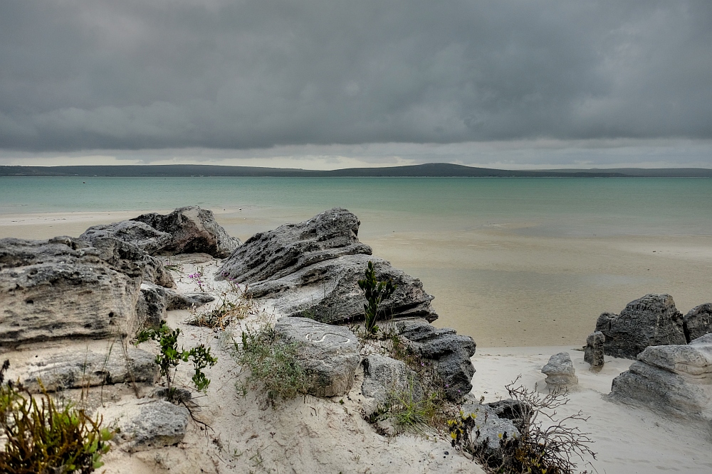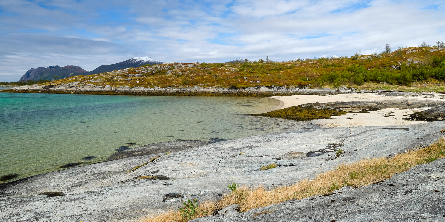 Kleiner weisser Sandstrand auf Laukvikneset am Bergsfjord.