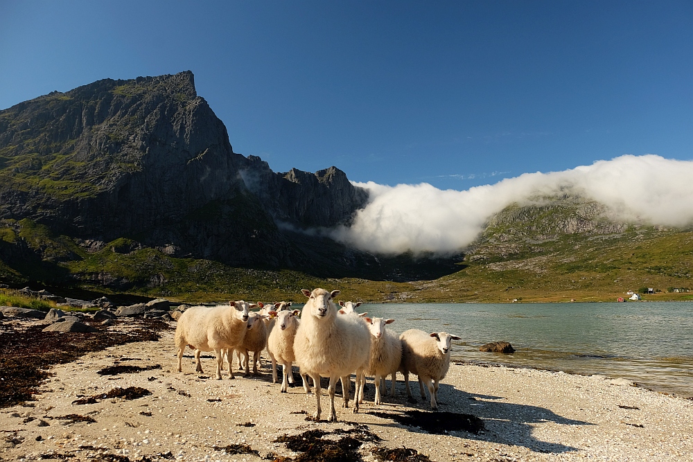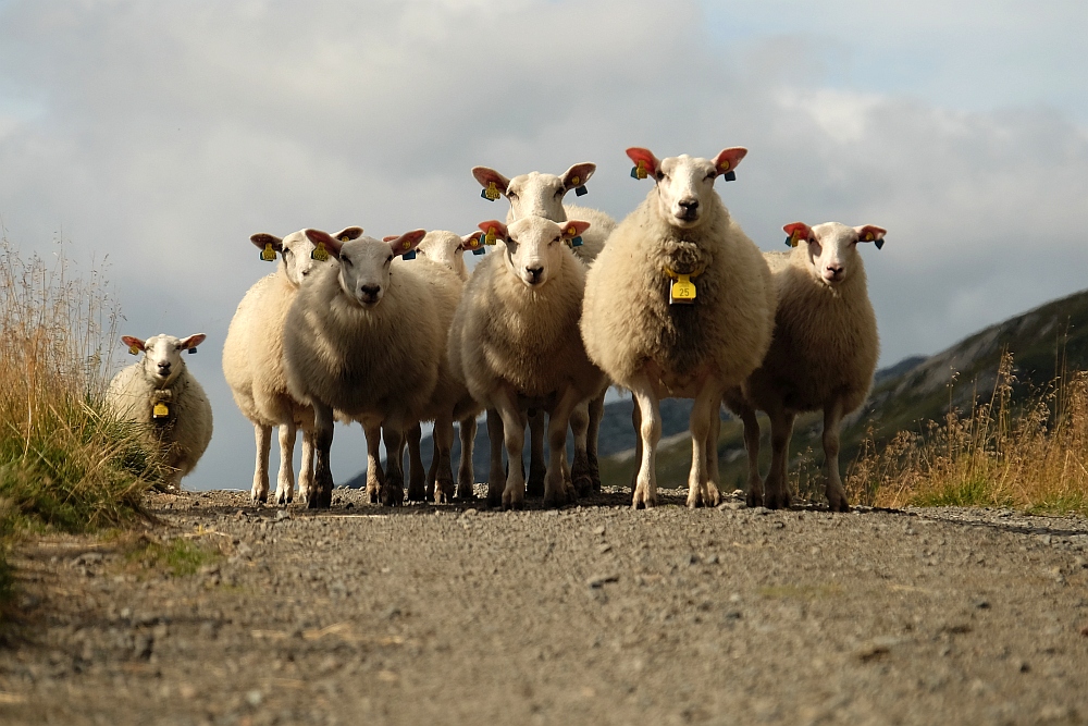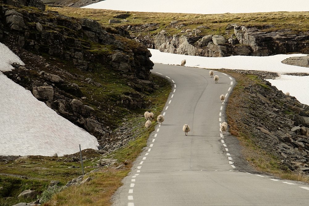 Auf den Strassen rund um den Sognefjord tauchen Schafe oft unmittelbar hinter der nächsten Kurve auf