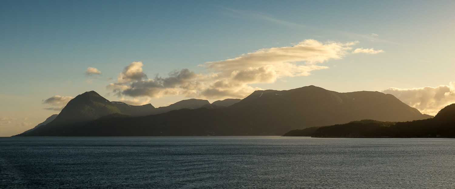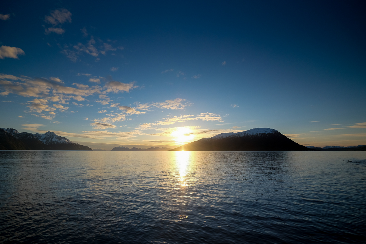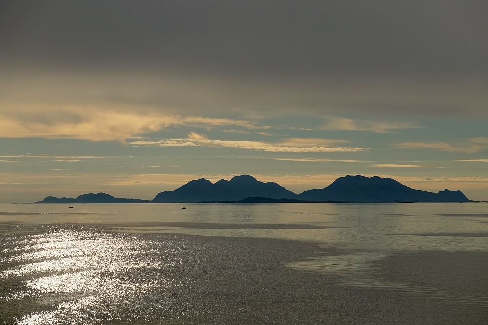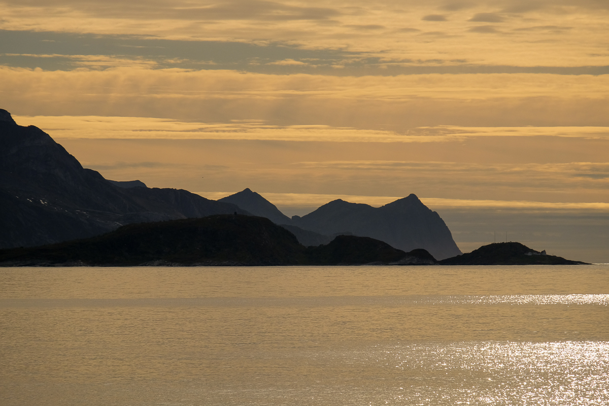 Der Vannsundet zwischen Reinøya und Vannøya wird durch die abendliche Sonne beleuchtet. Ein paar Stunden später erreichen wir Tromsø, wo wir zum zweiten Mal vom Schiff aufs Mietauto umsteigen.