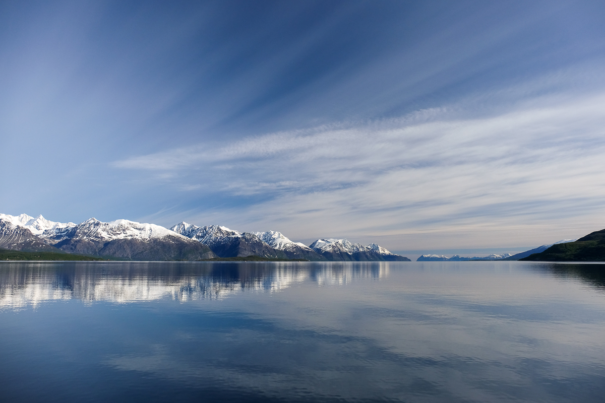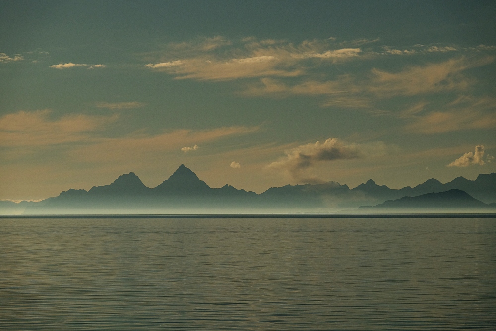 Am frühen Morgen auf der Fähre zwischen Kåfjord und Lyngseidet nehmen wir Abschied von den Lyngenalpen.