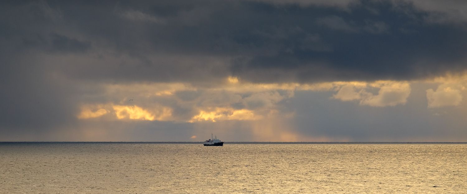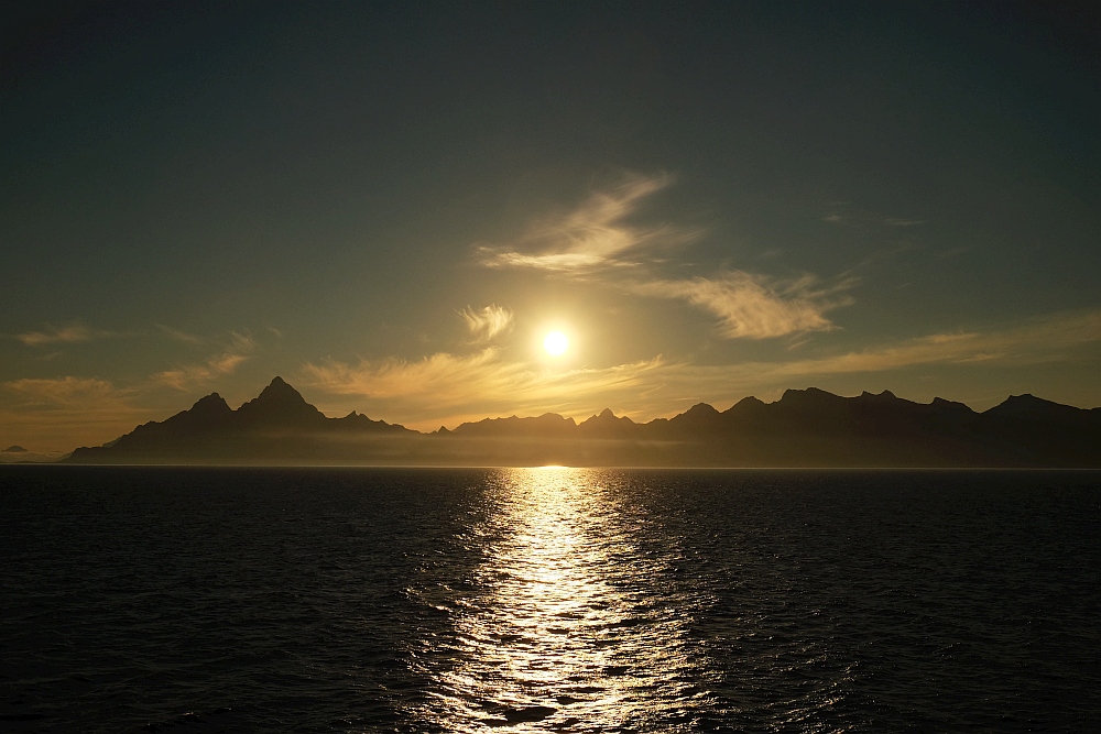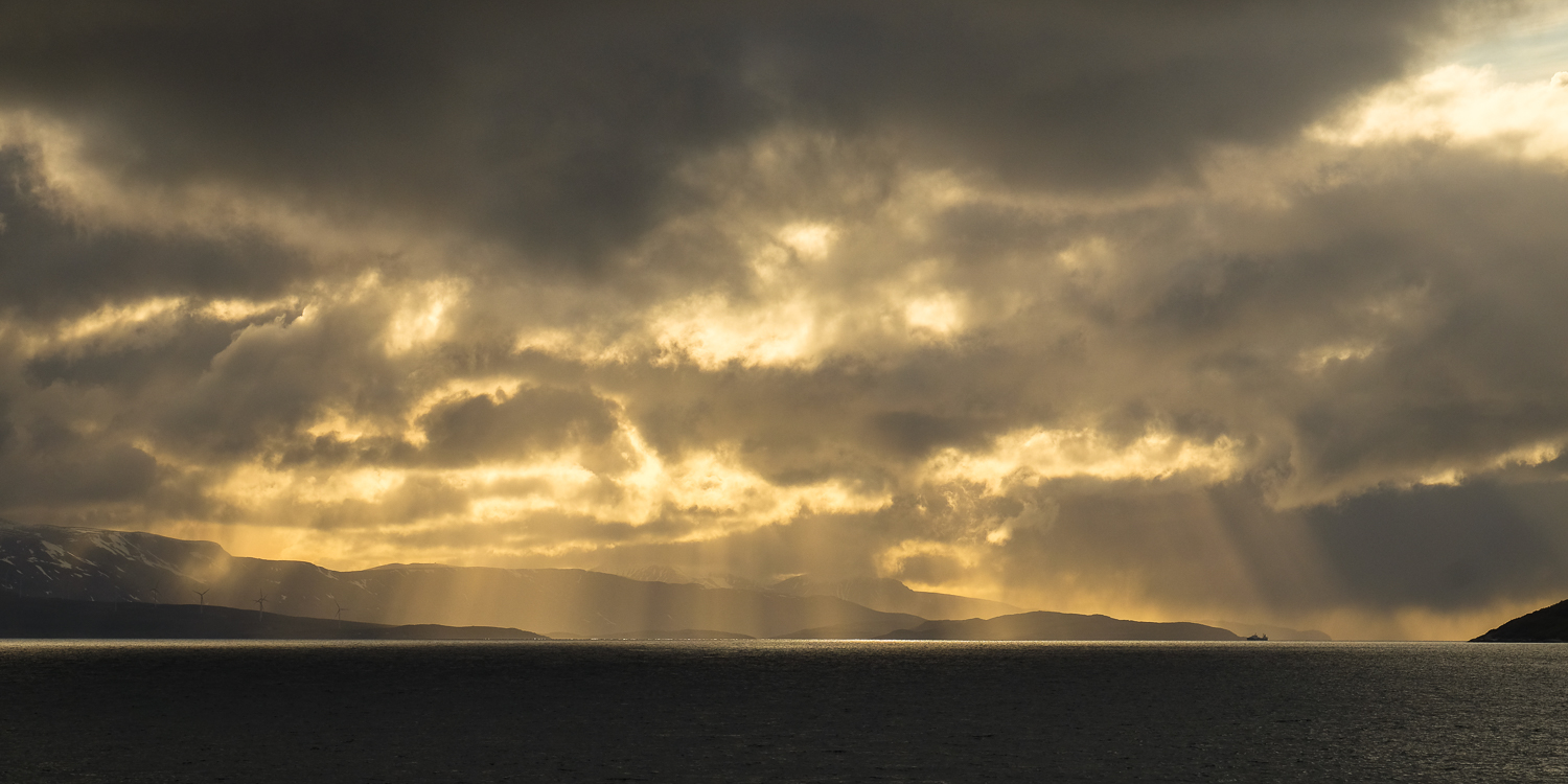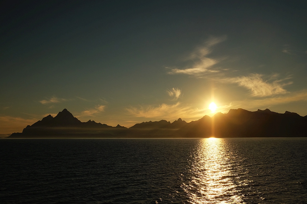 Die letzten Sonnenstrahlen kurz vor der Einfahrt in den Hafen von Svolvær