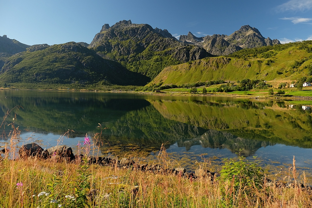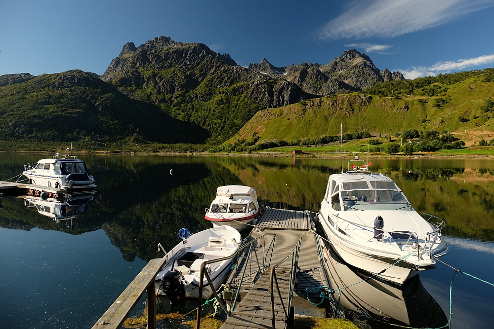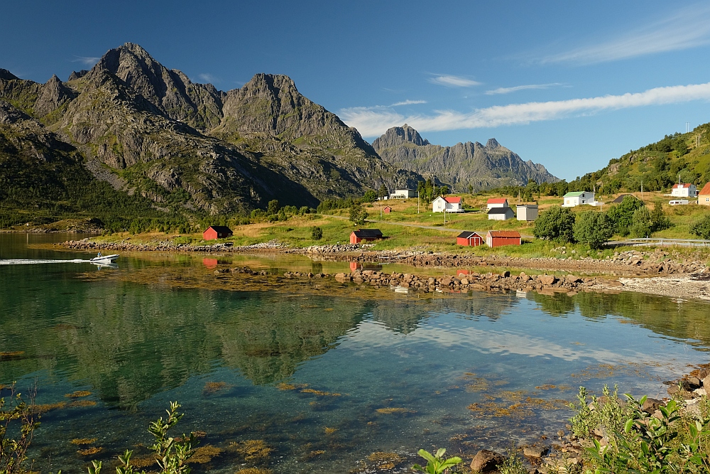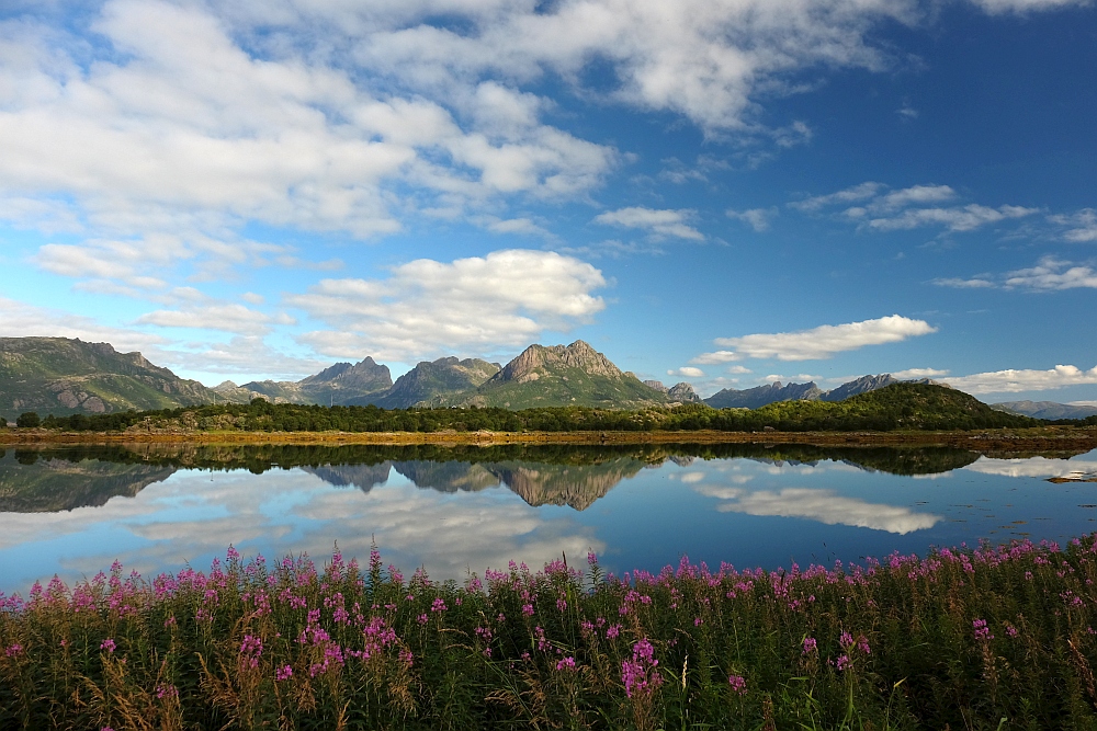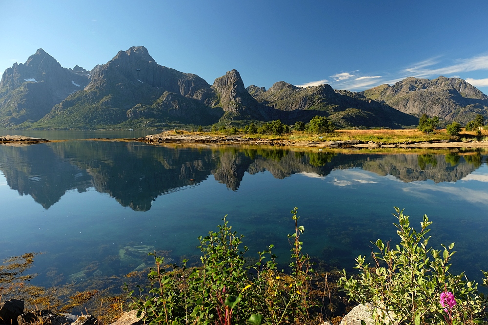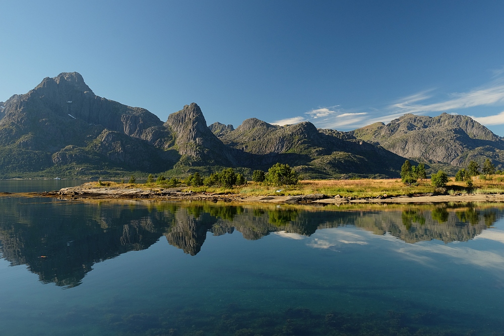 Der knapp 1000 Meter hohe Olsanestinden spiegelt sich im glasklaren Raftsund