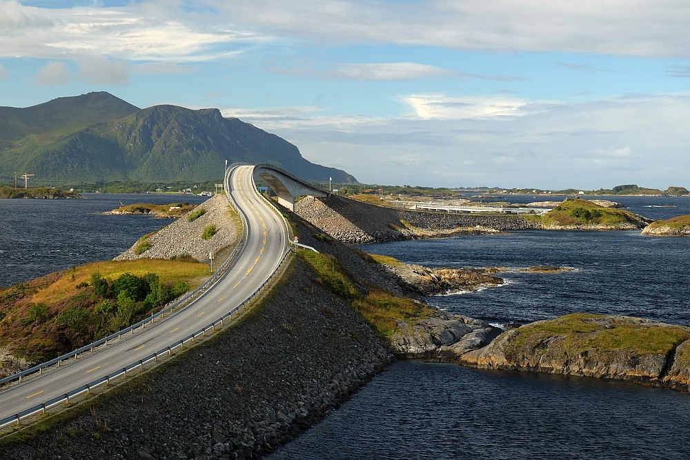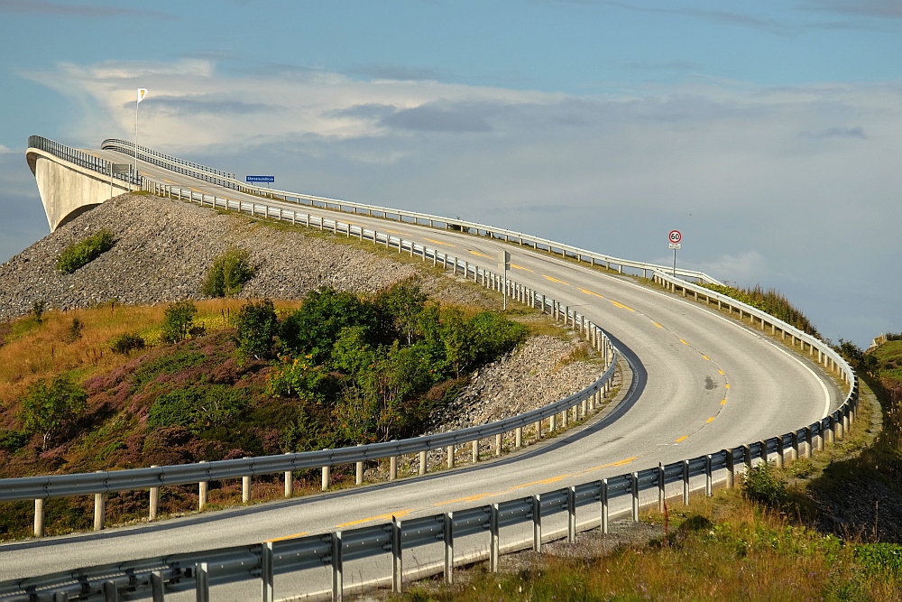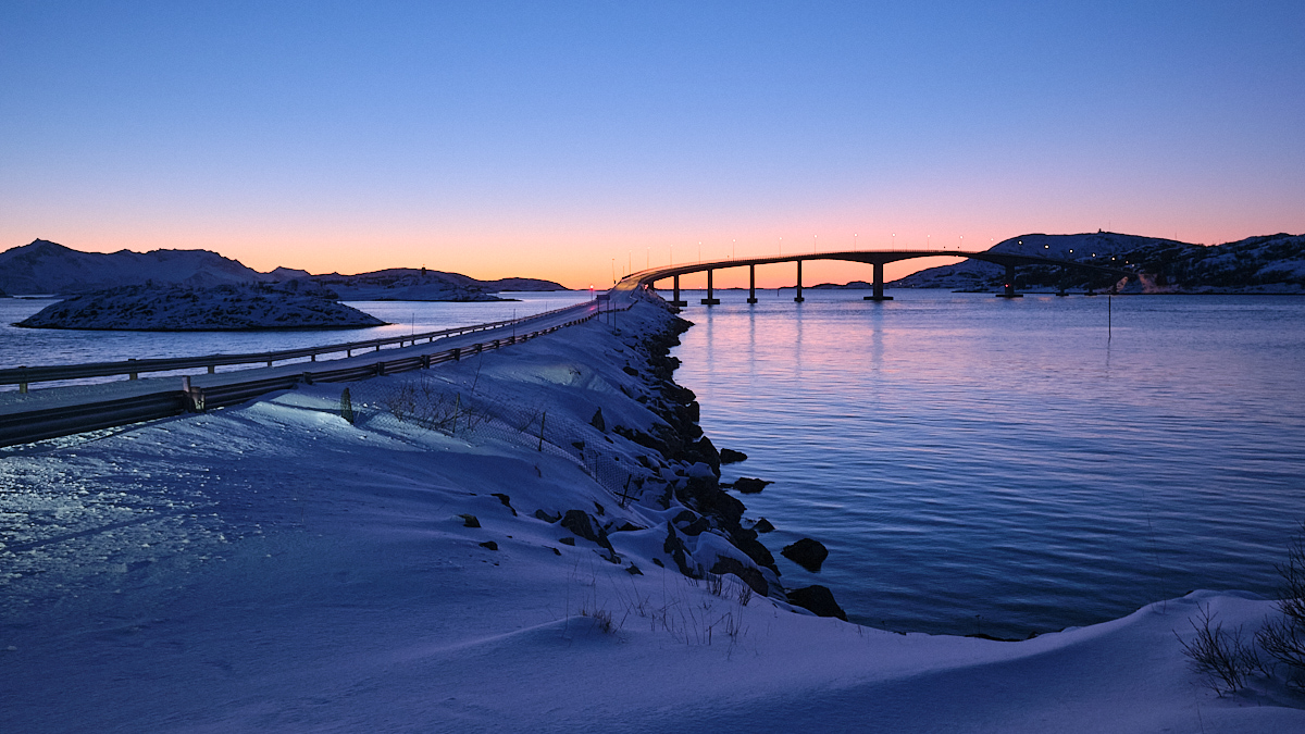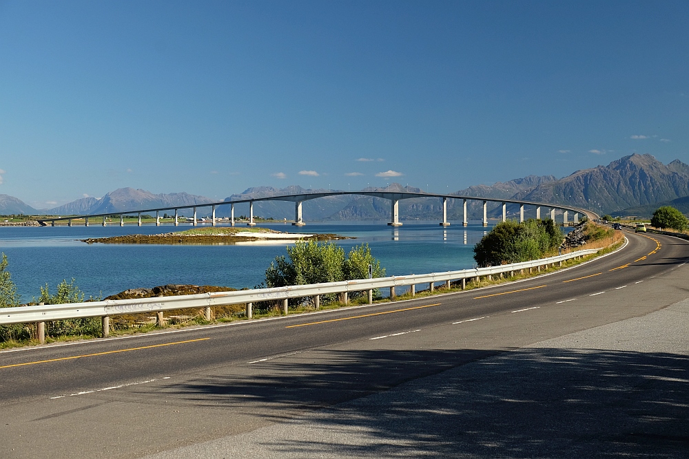 Neben unzähligen Fährverbindungen gibt es in Norwegen zahllose Brücken über, und Tunnels unter den Fjorden. Hier die Hadselbrua bei Stockmarknes