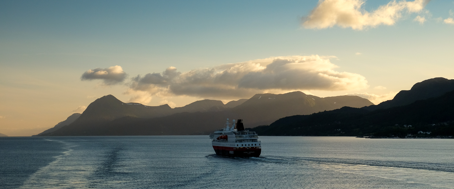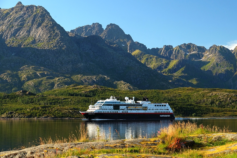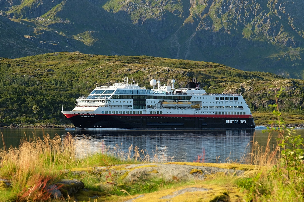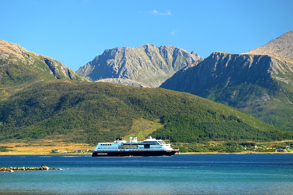 Die MS Midnatsol der Hurtigruten auf Südkurs kurz nach Sortland auf den Vesterålen