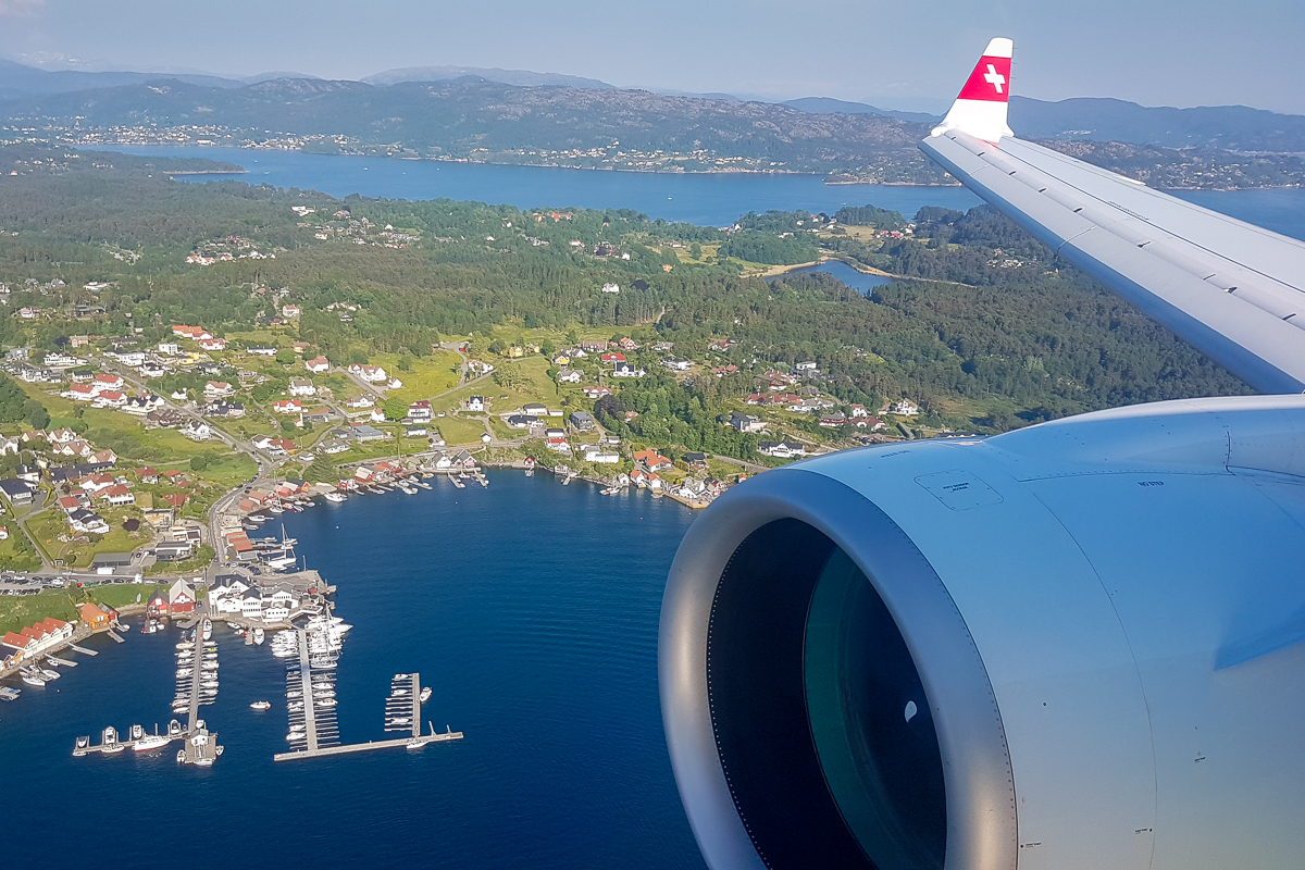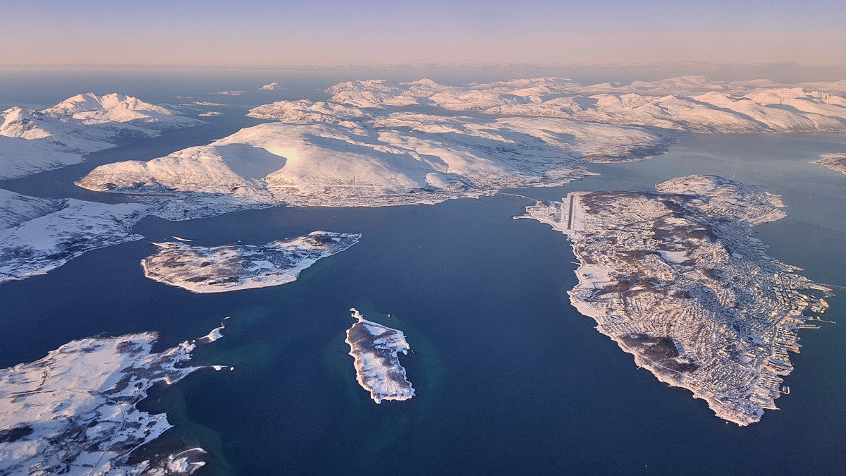 Anflug auf Tromsø. Die Stadt und der Flughafen liegen auf einer Insel zwischen dem norwegischen Festland und der Insel Kvaløya.