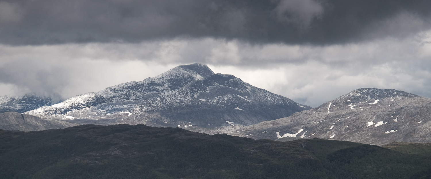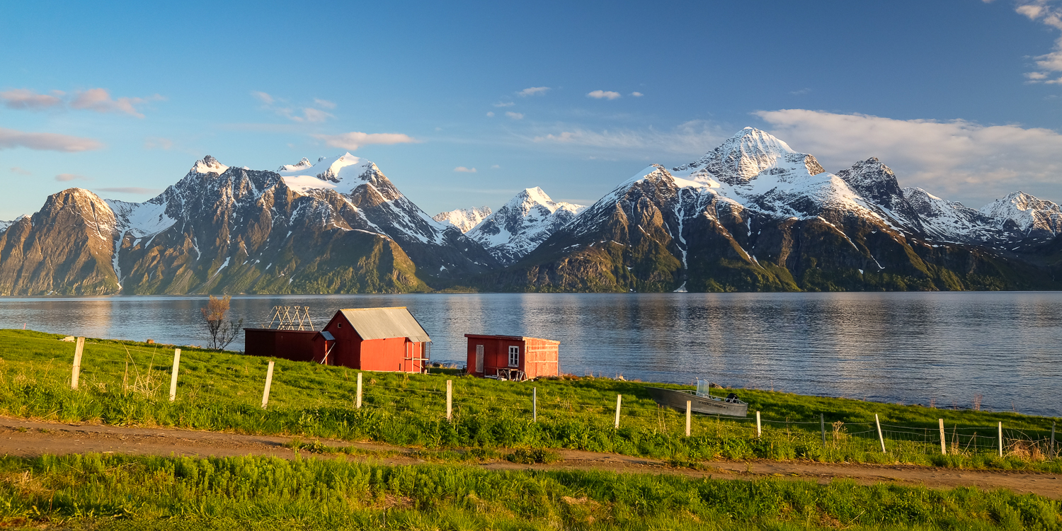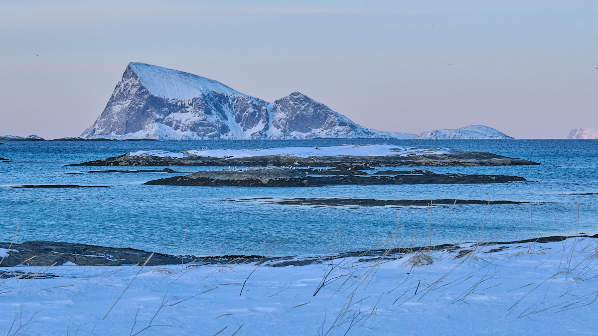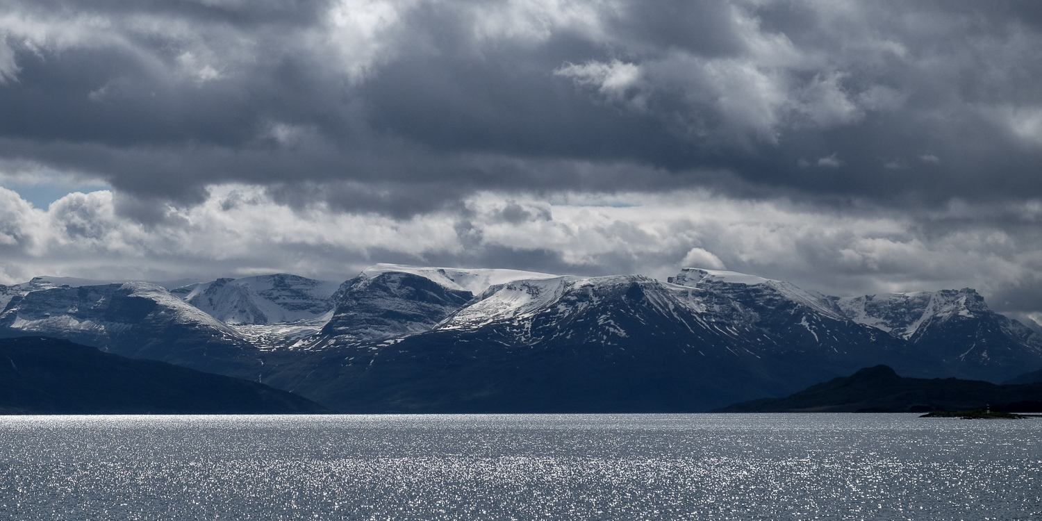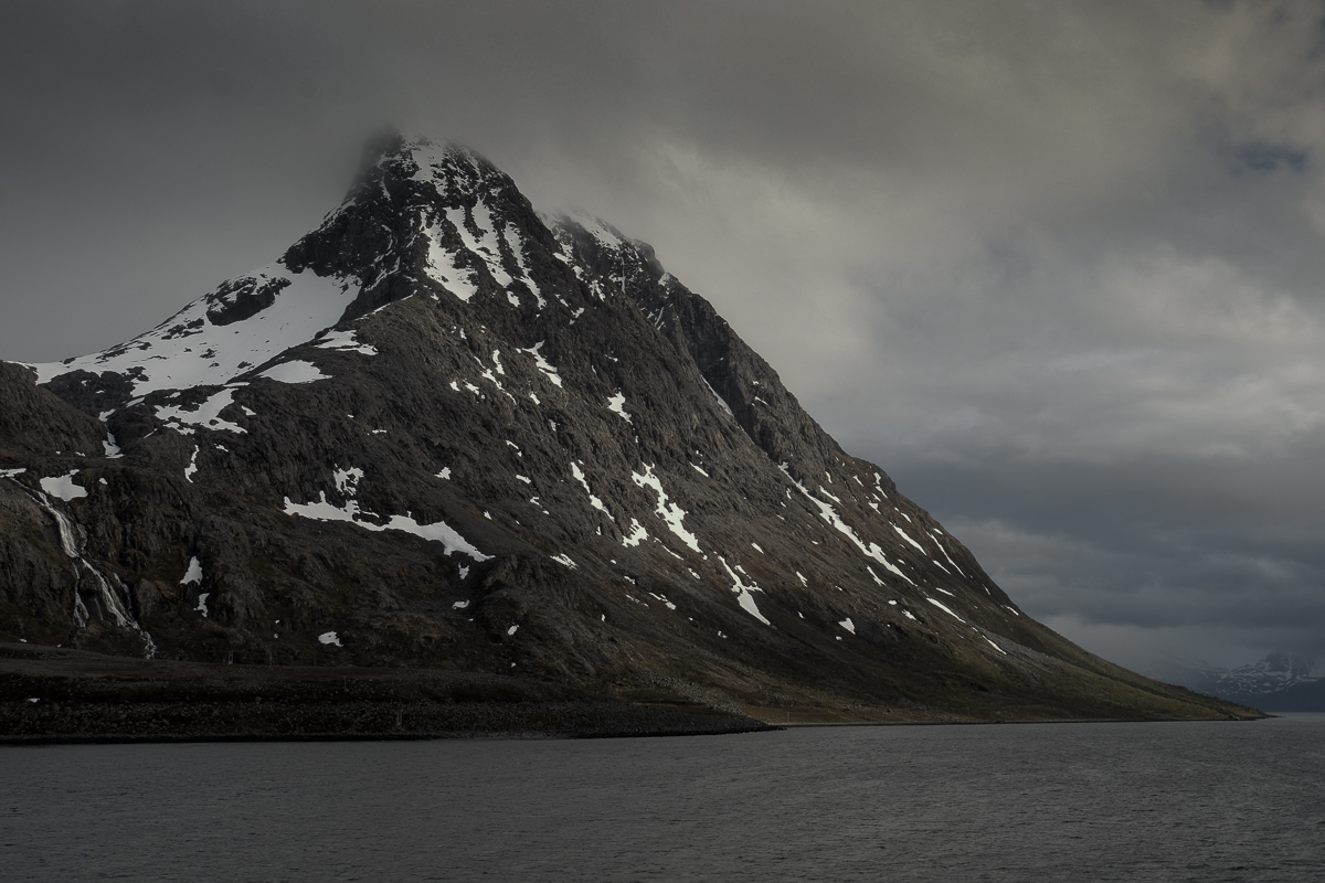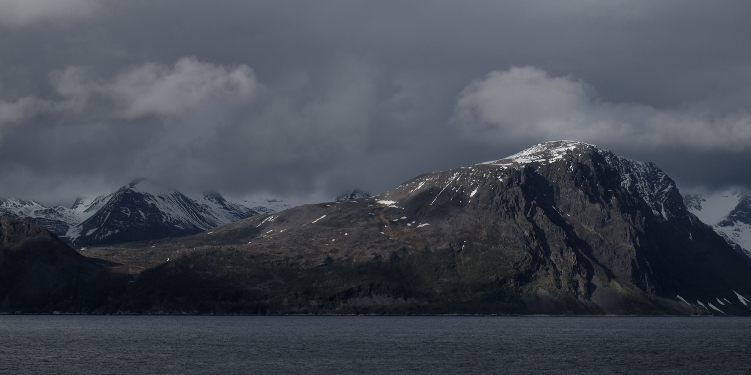 Am Bergsfjord auf Laukvikneset; der gut 600 Meter hohe Husfjellet gegenüber ist auch im Juni schneebedeckt.