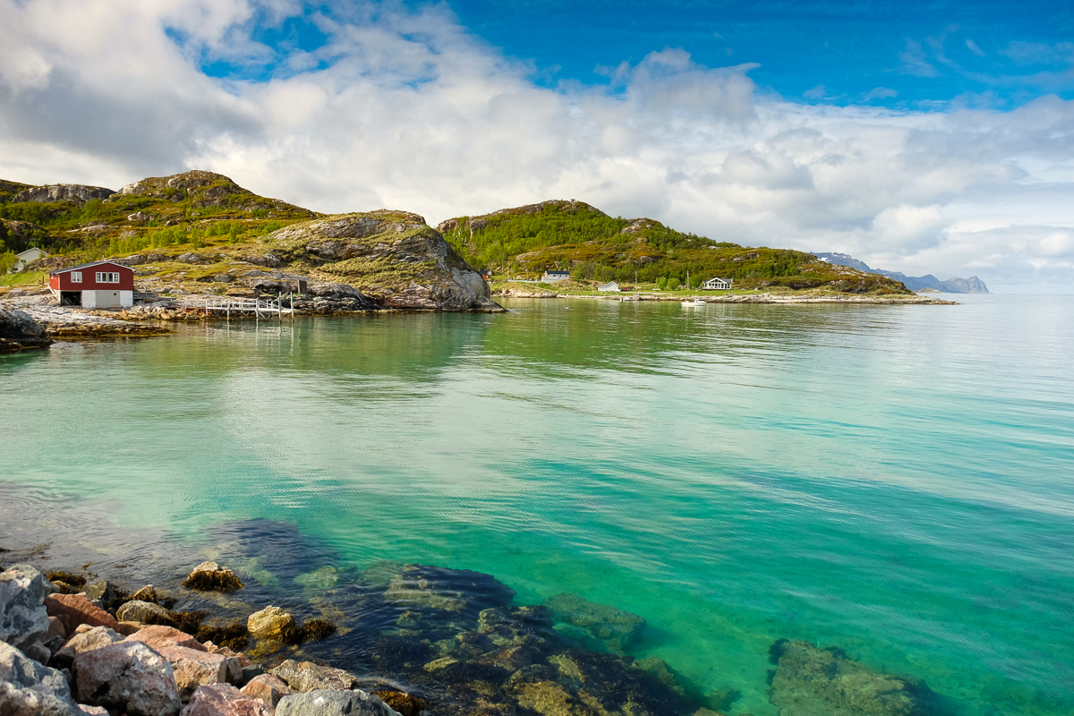 Türkisblaues, glasklares Wasser am Hafen von Brensholmen auf Kvaløya.