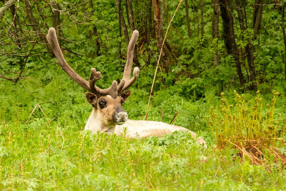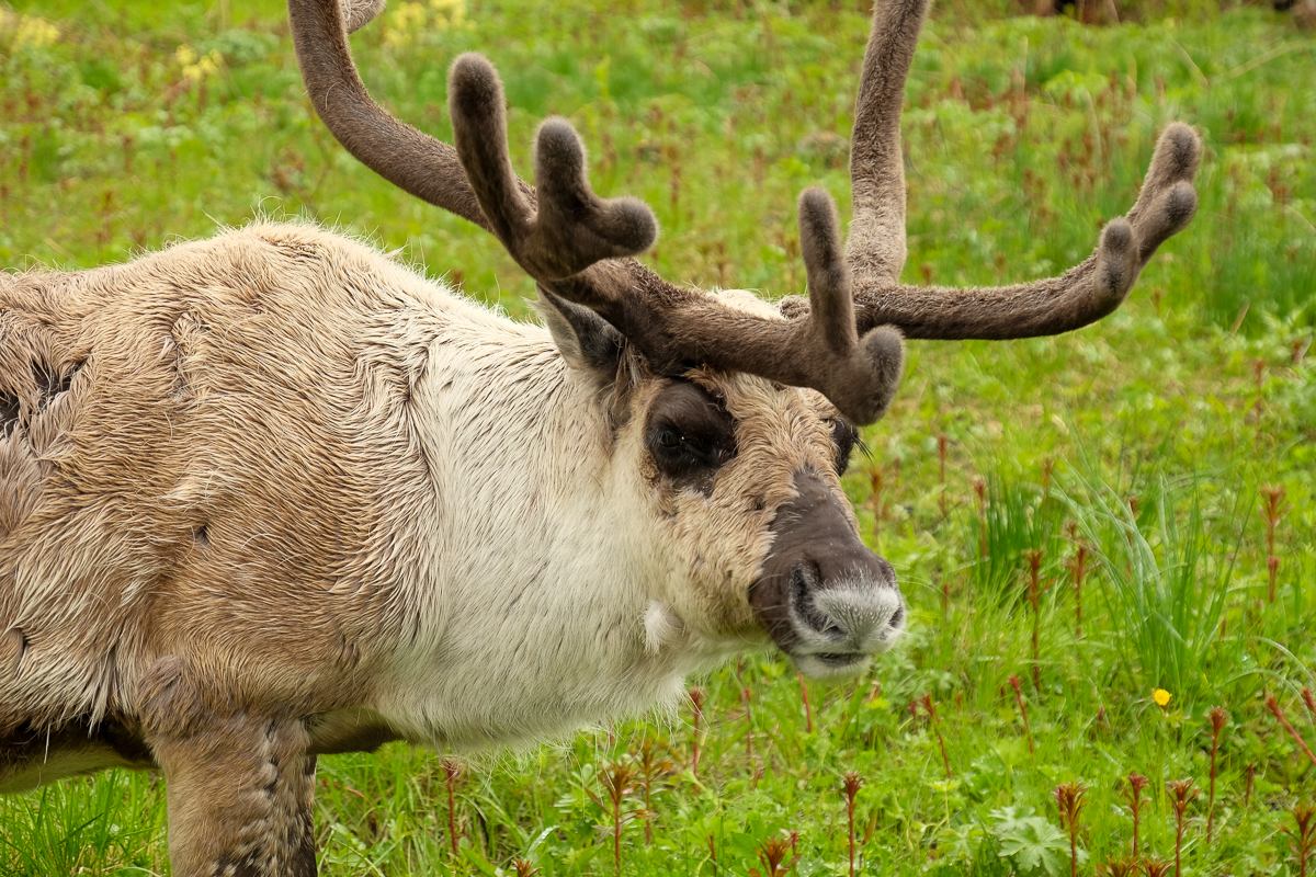 Rentier-Siesta im saftigen Grün auf Kvaløya.