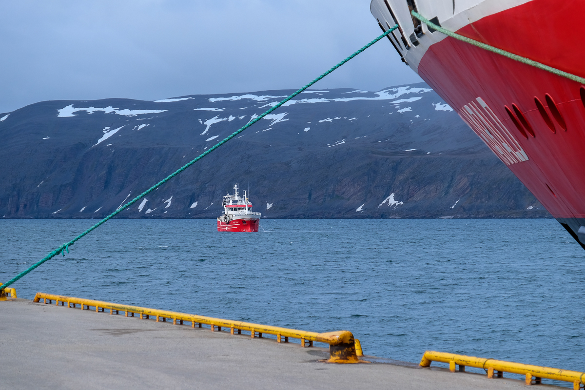 Begegnung mit der MS Lofoten bei Berlevåg. Sie fährt ebenfalls für die Hurtigruten und ist deren ältestes Schiff.