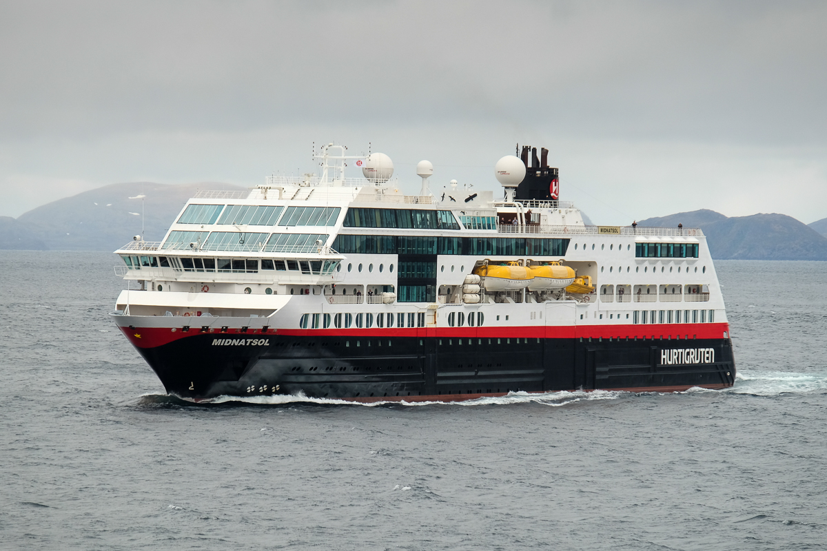 Die MS Midnatsol begegnet uns kurz nach Havøysund. Ihre Länge beträgt 136 Meter, sie wurde 2002 in Dienst gestellt und verfügt über 298 Kabinen.