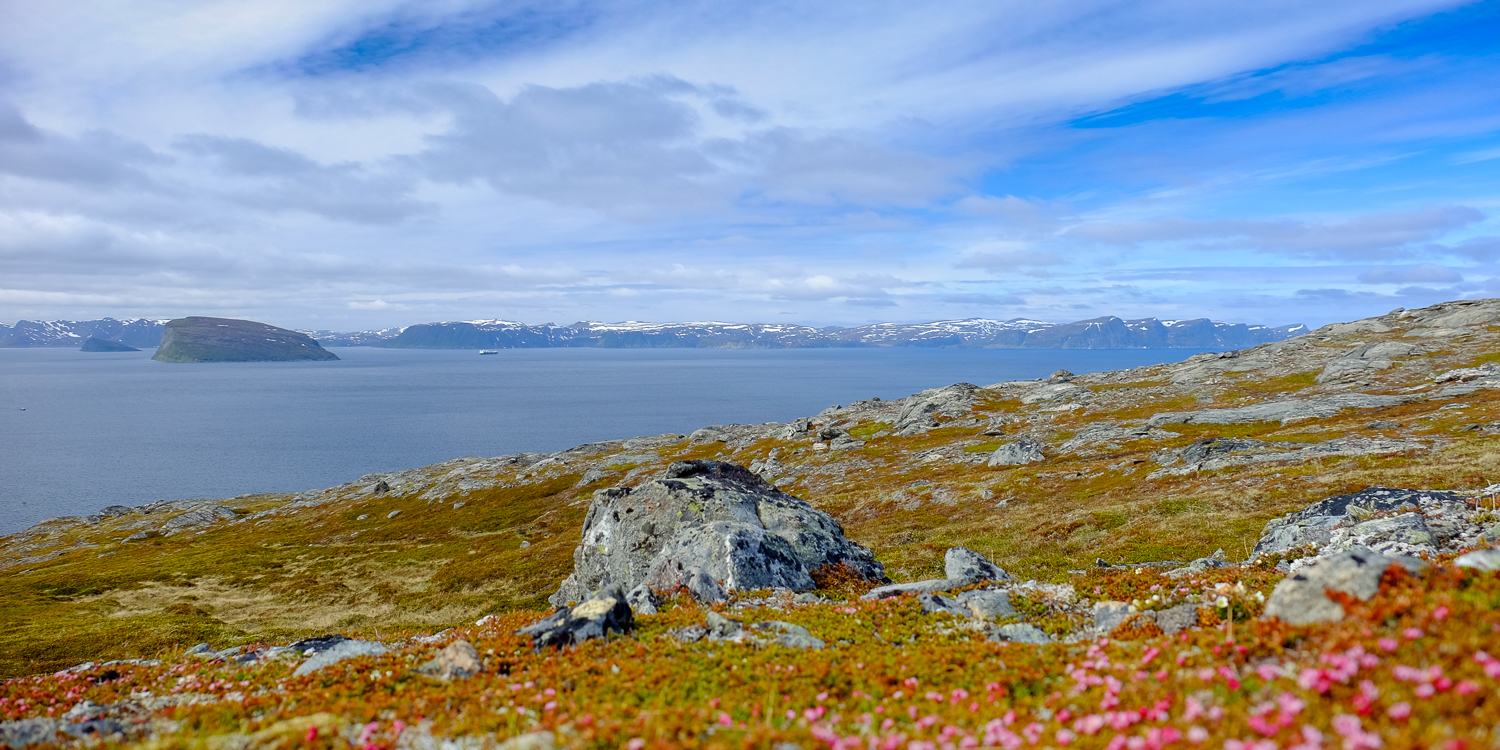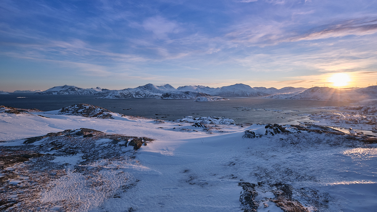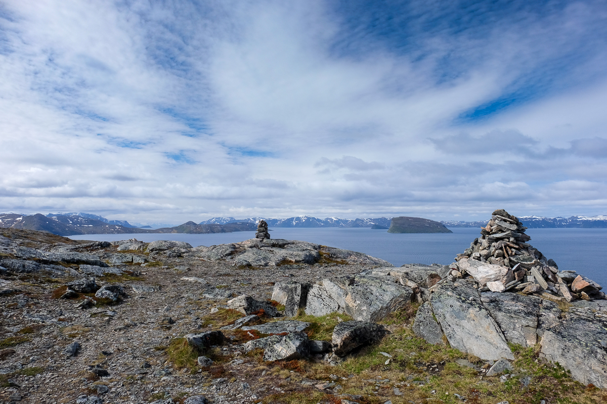 Von einer kleinen Hochebene oberhalb Hammerfest hat man einen schönen Blick auf den Søroysundet und das dahinter liegende Søroya.
