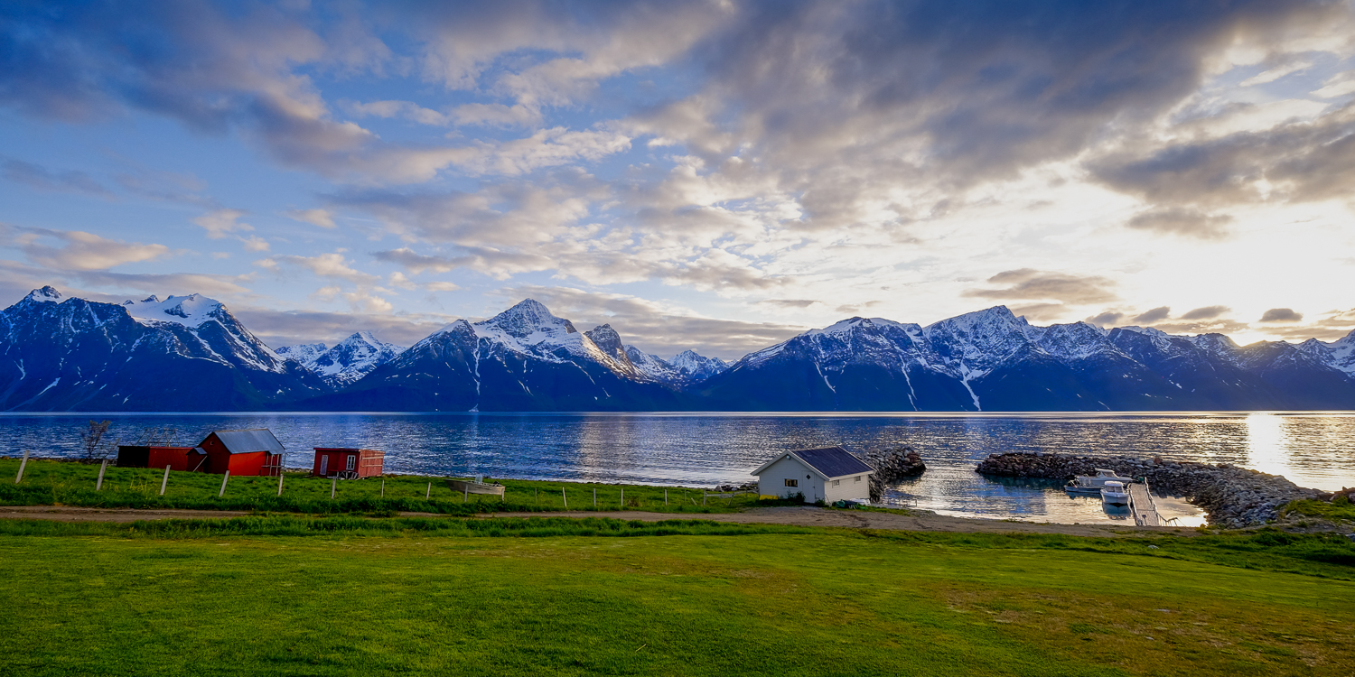 22:37 Uhr: ein kleiner Hafen bei Spåkenes, im Hintergrund die majestätischen Lyngenalpen.