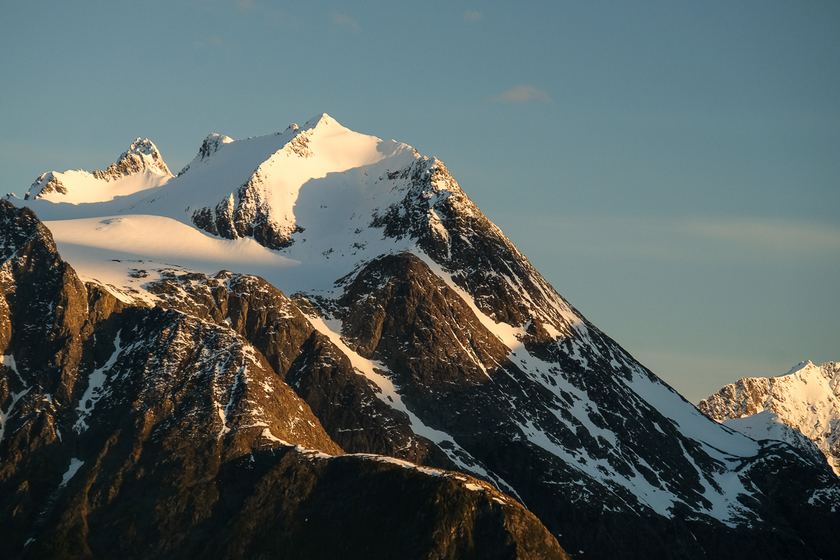 Wunderschön, wie die Gletscher der über 1600 Meter hohen Lyngenalpen in der Mitternachtssonne erstrahlen.