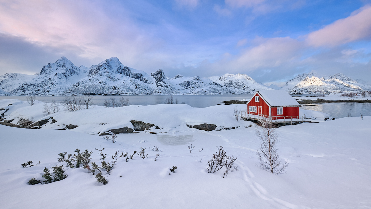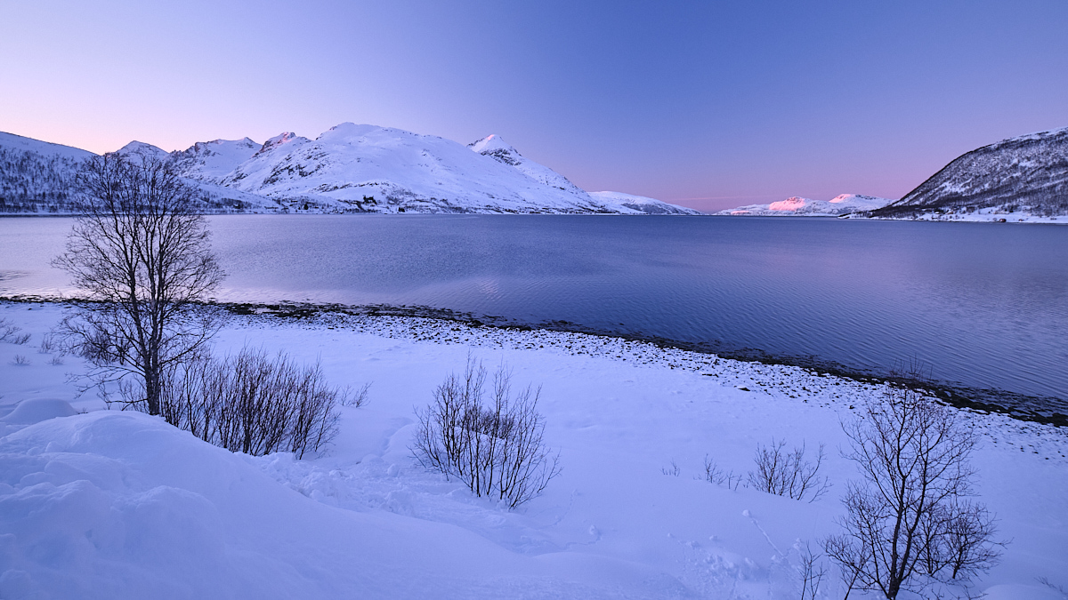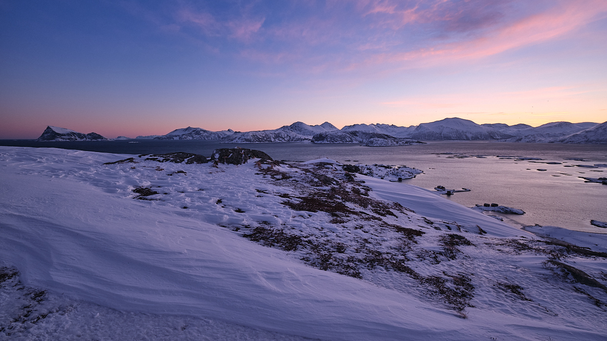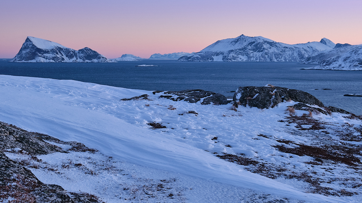 Letztes purpurnes Tageslicht bei Sandneshamn am Kattfjord.