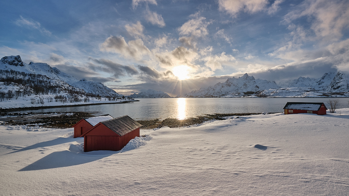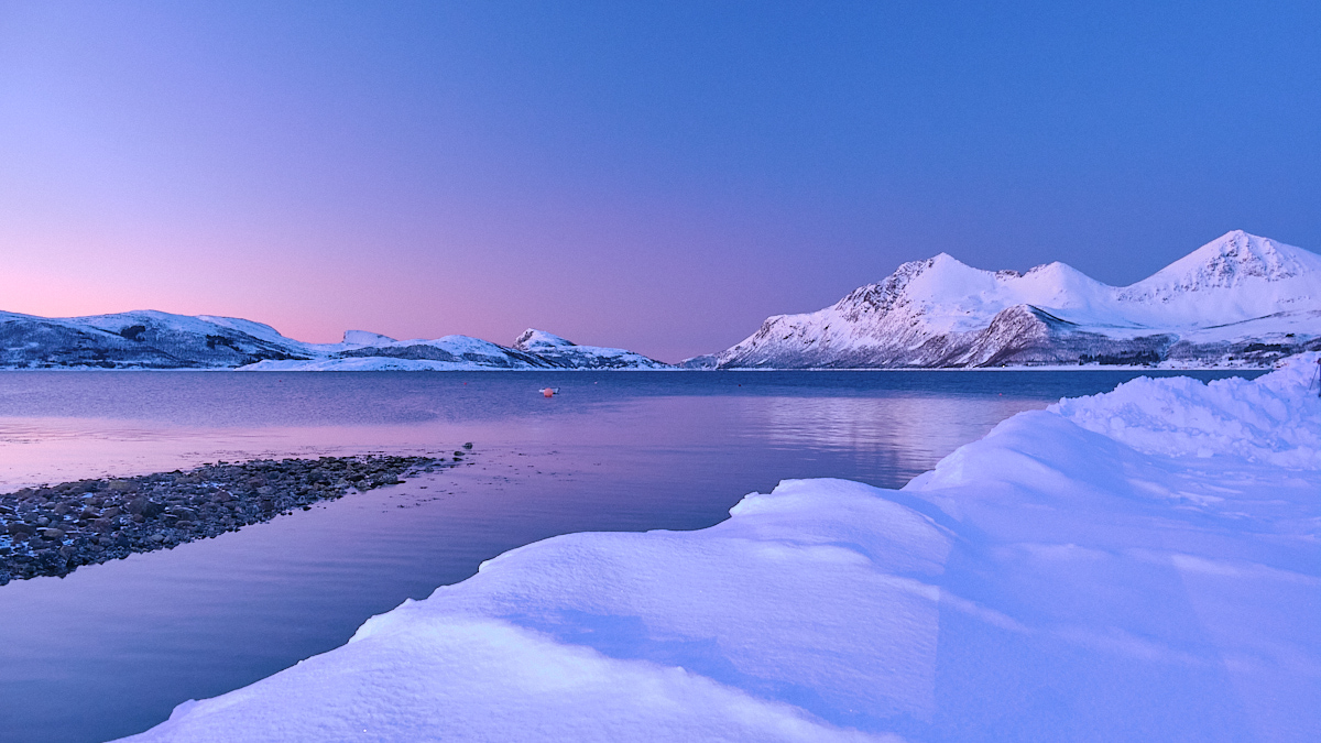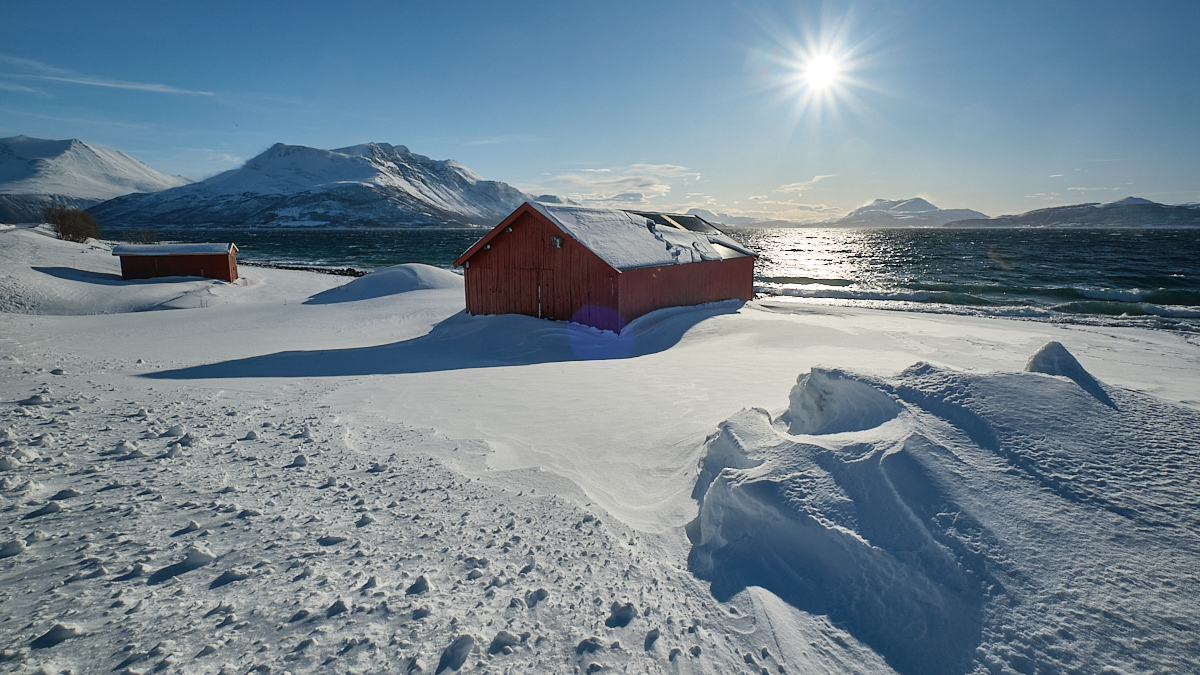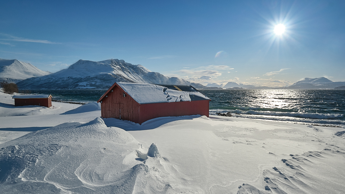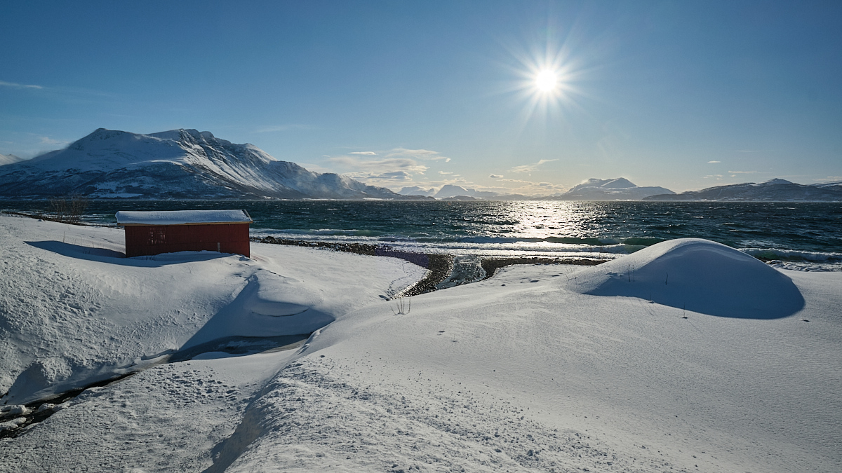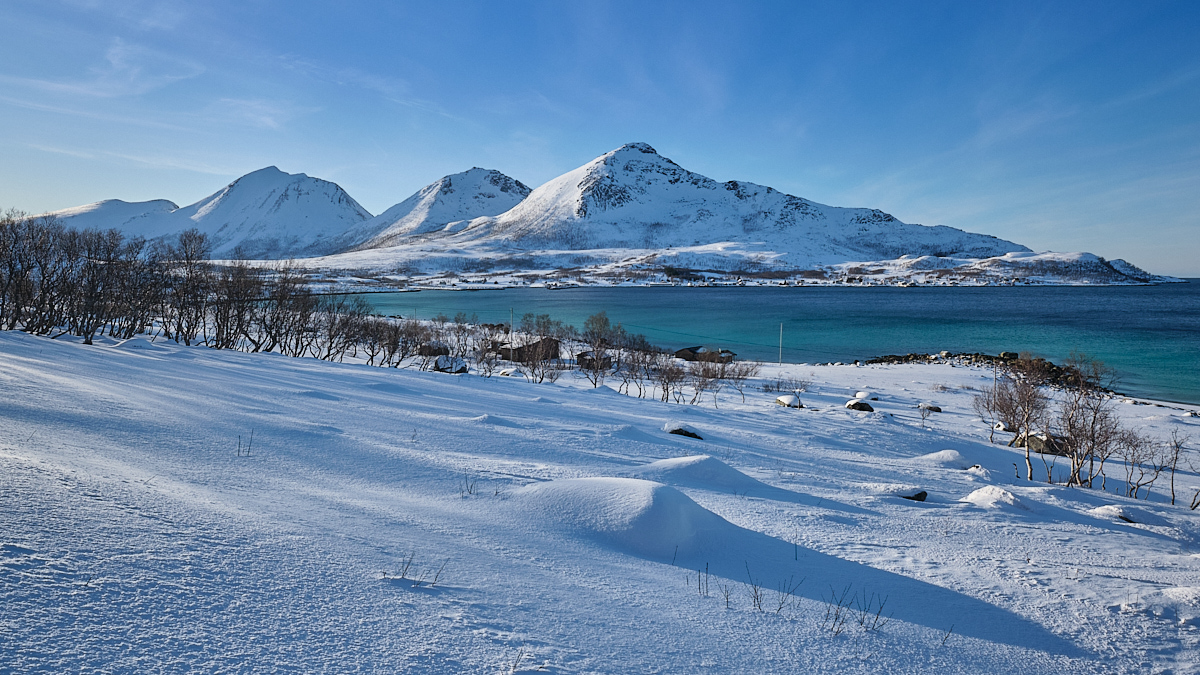 Sonne, Meer und Schnee am Straumsfjord an der Südküste von Kvaløya.