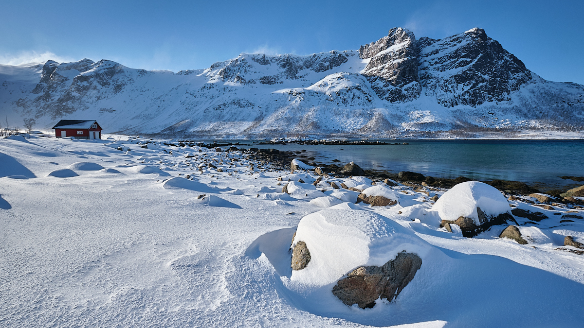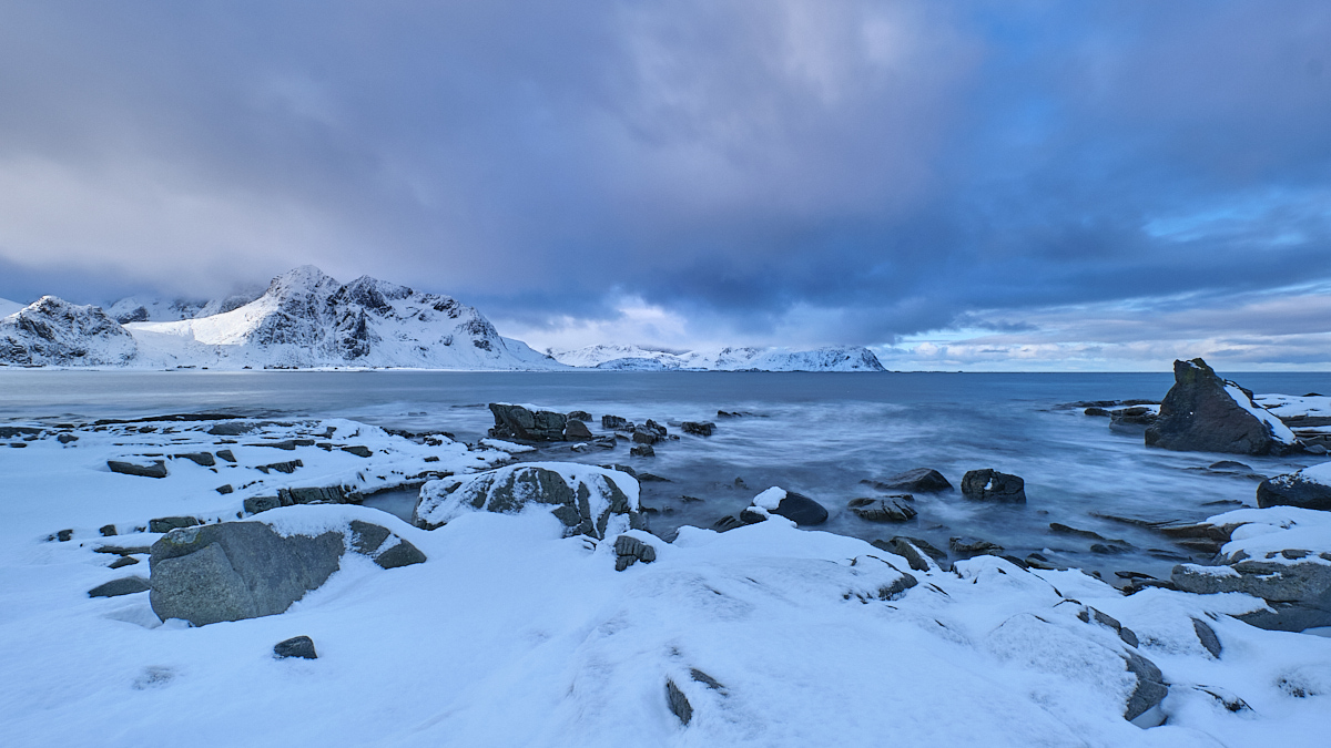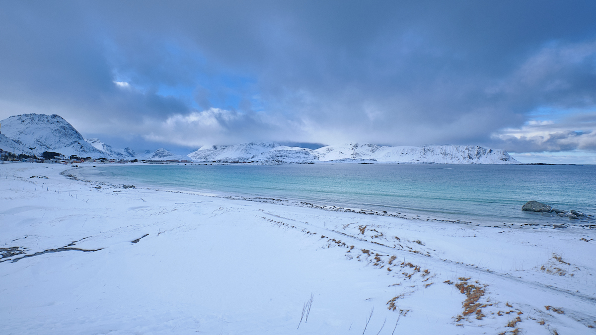 Der verschneite Sandstrand in der Bucht von Jusnesvika an der Nordküste der Lofoten.