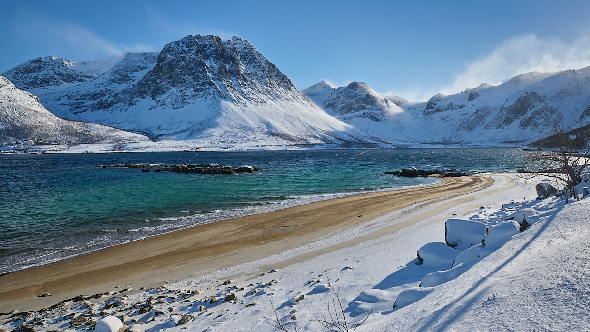 In Nordnorwegen keine seltene Kombination: türkisblaues Wasser und Sandstrände mit tief verschneiten Bergen