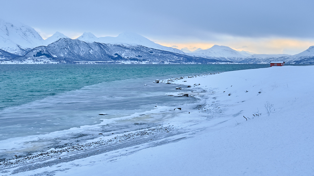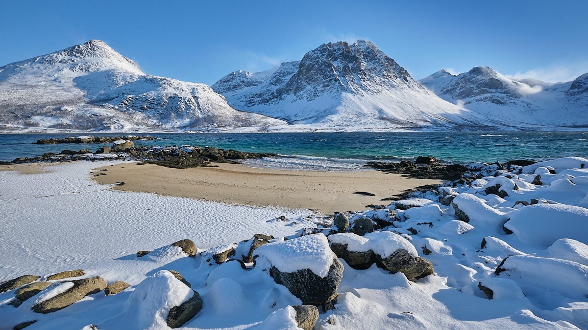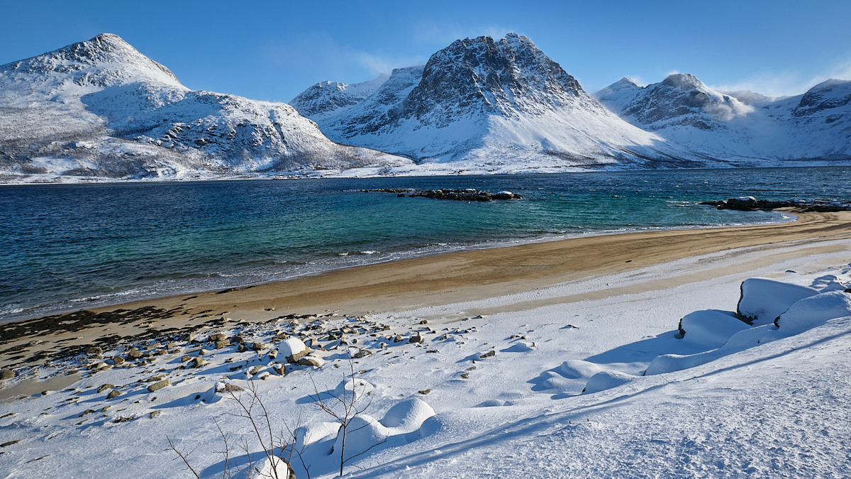 Verschneiter Sandstrand am Grøtfjord auf Kvaløya.