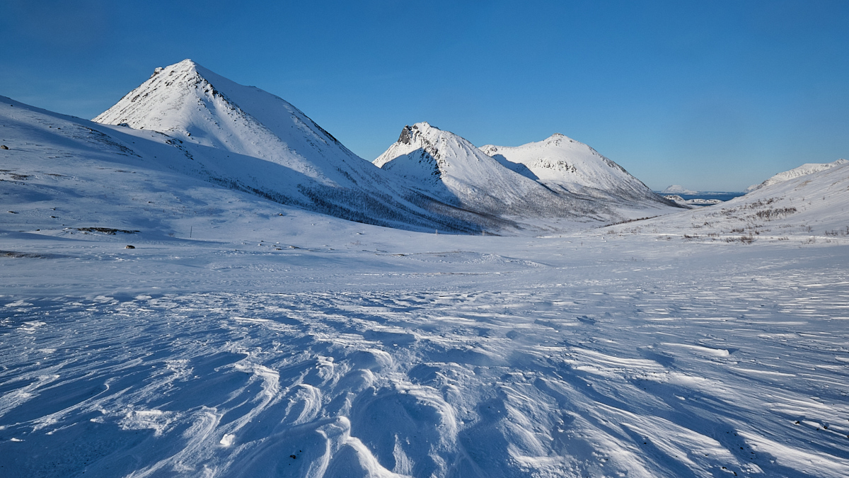 Schneeverwehungen am Straumsfjord an der Südküste von Kvaløya.