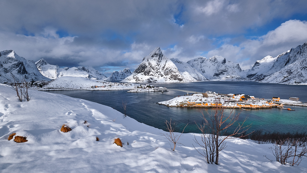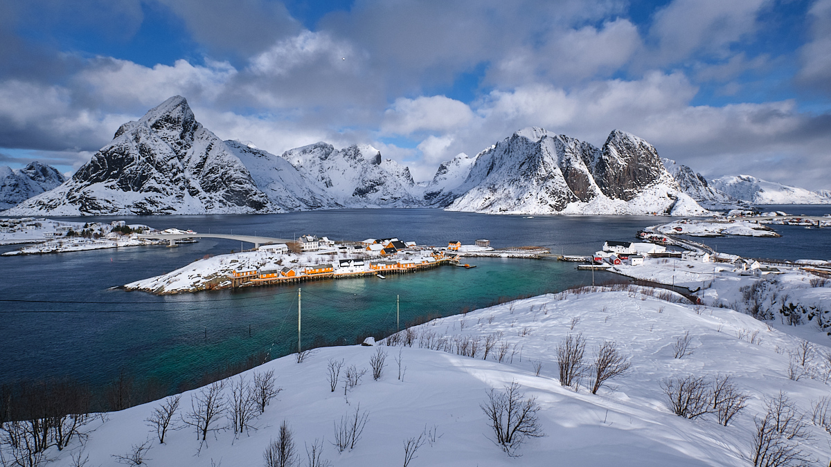 Der Fjord von Reine ist umgeben von den steilen Flanken des Lofotengebirges.